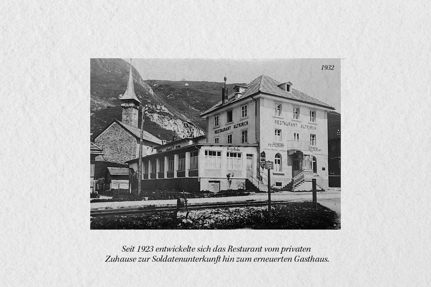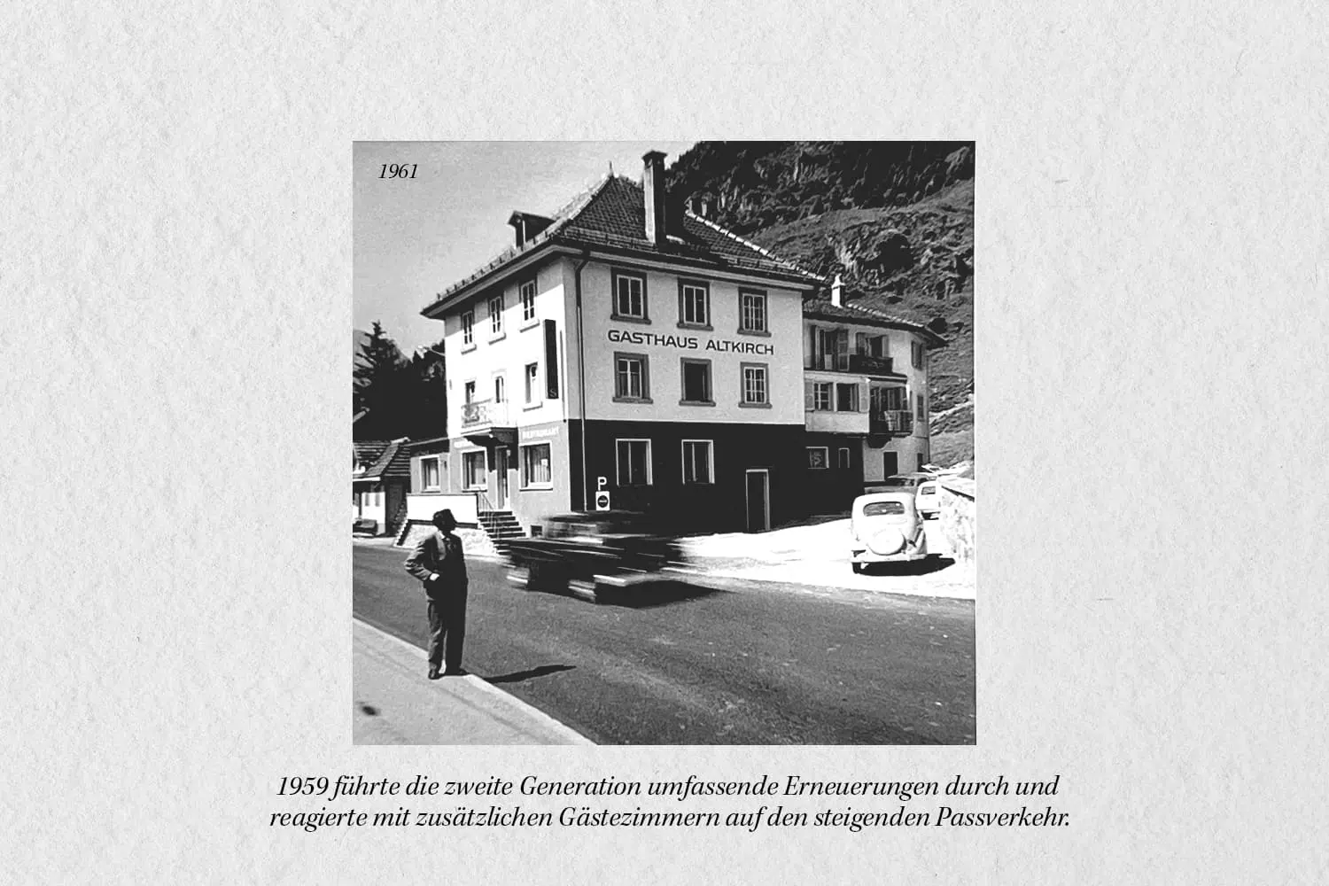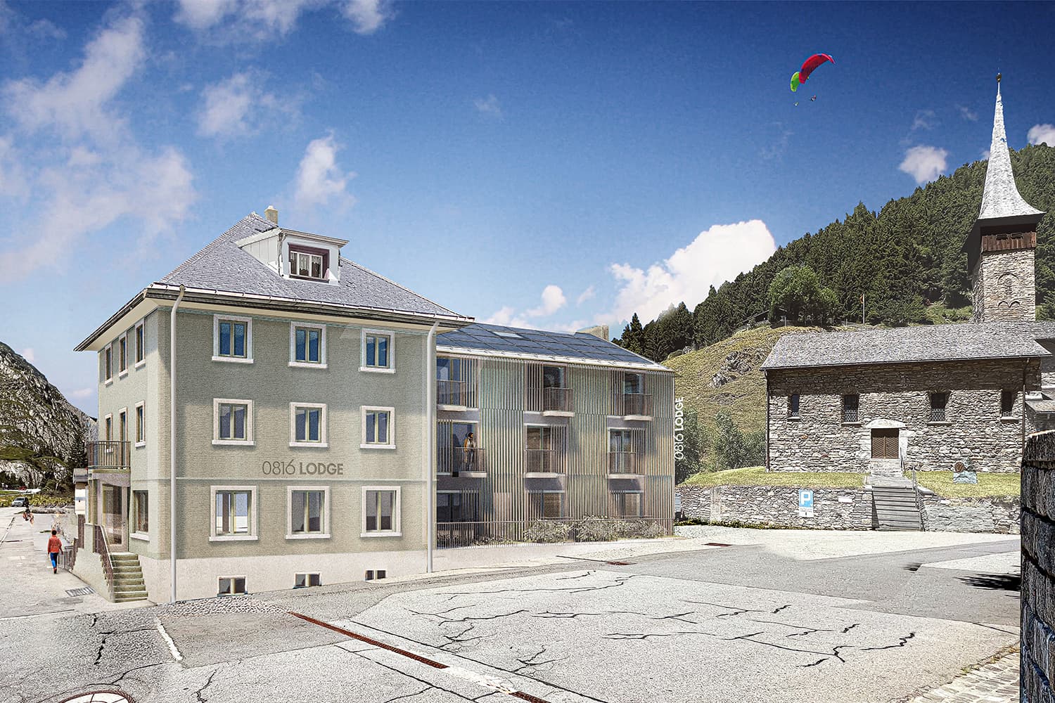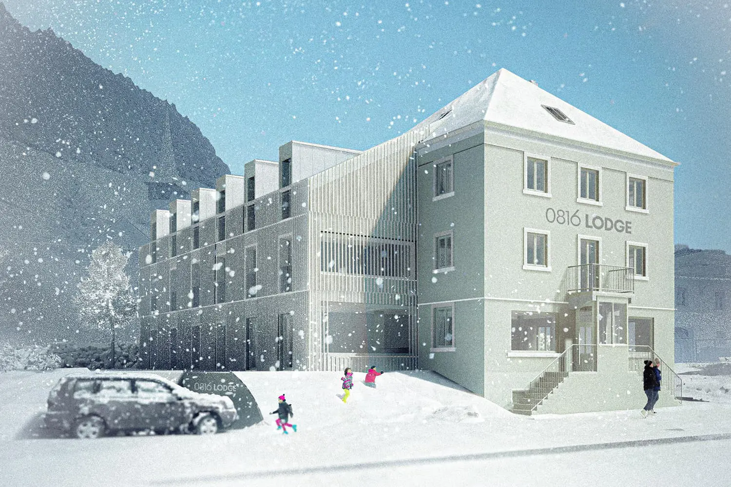 Andermatt liegt als Hochtal nahe der Gipfel und erscheint in unmittelbarer Beziehung zum Himmel. Die alpine Landschaft ist geprägt von grauen und beigen Gesteinen, orange gesprenkelten Felsstrukturen, satten Wiesen und dunklen Tannen. Die Farbigkeit wirkt zurückhaltend und dauerhaft. Bauten reagieren hier auf starke Witterung, grosse Temperaturschwankungen und lange Winter. Der Ort dient gleichermassen der Erholung wie auch sportlichen Nutzungen und besitzt einen eigenständigen Charakter zwischen Passlandschaft und Siedlung. Bestand und Erweiterung werden zu einer zusammenhängenden Einheit geführt. Eine einheitliche Dachhaut und durchgängige Spenglerarbeiten verbinden die Baukörper zu einer gemeinsamen Silhouette. Ein gebrochenes Grün bildet die Grundfarbe beider Volumen und nimmt Bezug auf Vegetation und Gestein. Der Neubau wird durch eine feine Holzlattung differenziert, ohne sich vom Gesamtbild zu lösen. Ziel ist ein Gebäude, das sich über die Jahreszeiten hinweg ruhig in das Ortsgefüge einordnet. Der historische Bestand – das Hotel Altkirch – trotzt seit Jahrzehnten Wind, Schnee und starken Temperaturschwankungen. Seine Präsenz ist Teil der lokalen Erinnerungsschicht und erzählt von der Entwicklung des Passortes als Aufenthalts- und Durchgangsort. Unmittelbar daneben steht eine Kapelle aus dem 11. Jahrhundert, einer der bedeutendsten romanischen Sakralbauten des Kantons Uri. Südlich schliessen militärische Anlagen des 19. Jahrhunderts an. Diese Überlagerung verschiedener Epochen verleiht dem Ort Tiefe und Massstab. Die Erweiterung sucht daher nicht nach Dominanz, sondern nach Anschlussfähigkeit. Historische Motive werden nicht kopiert, sondern in Proportion, Materialwahl und Volumen neu interpretiert. So entsteht ein Gefüge, das Vergangenheit und Gegenwart in ein sachliches Verhältnis setzt. Die Dachlandschaft entwickelt sich aus einfachen geometrischen Körpern. Der bestehende Bau erscheint als klar gefasstes Volumen mit pyramidalem Abschluss, der Anbau als länglicher Quader. Durch die Angleichung der Dachflächen entsteht ein zusammenhängendes Ganzes, das beide Teile lesbar belässt und dennoch verbindet. Die Materialwahl folgt dem rauen Klima des Standorts. Massive Wandaufbauten und mineralische Oberflächen sichern Dauerhaftigkeit. Der Anbau wird in robustem Mauerwerk ausgeführt und mit Putzflächen kombiniert. Metallene Elemente setzen präzise Akzente und strukturieren Öffnungen und Kanten. Das Gebäude versteht sich als ruhiger Körper im Gefüge der Berge – widerstandsfähig, reduziert und im Dialog mit seiner Umgebung.