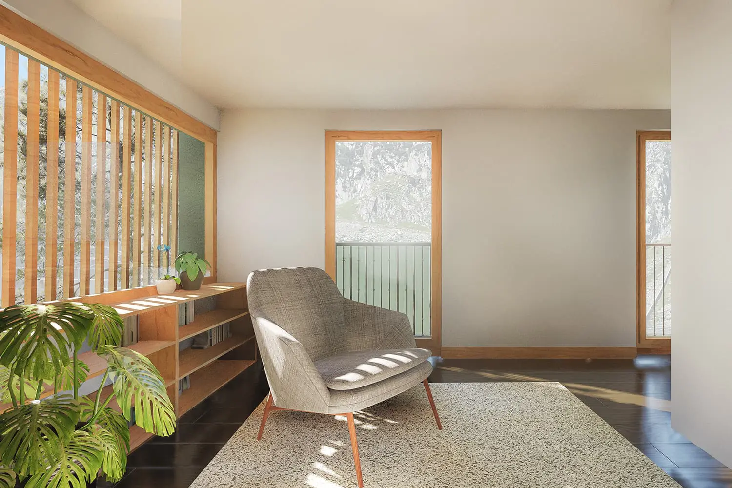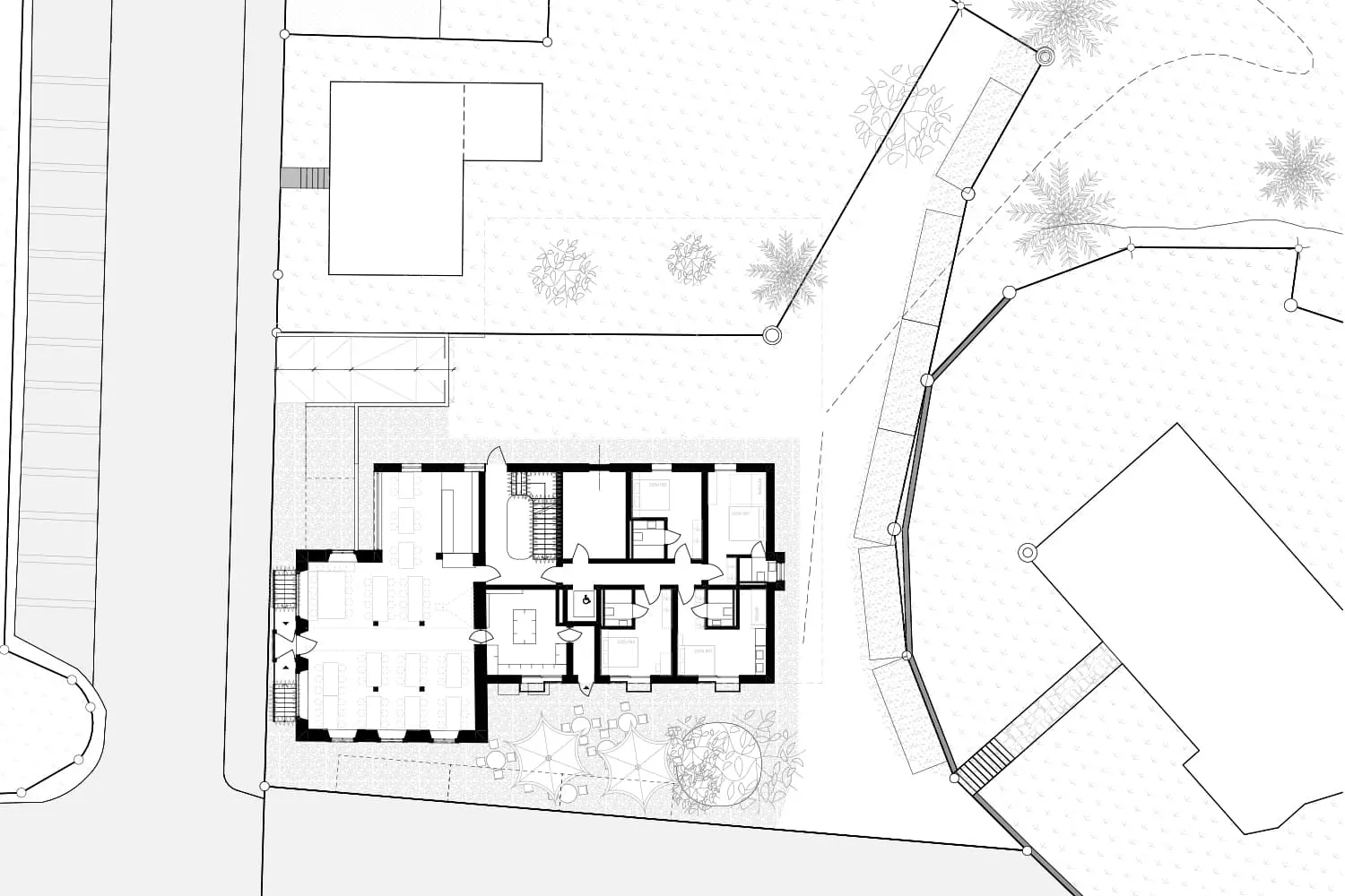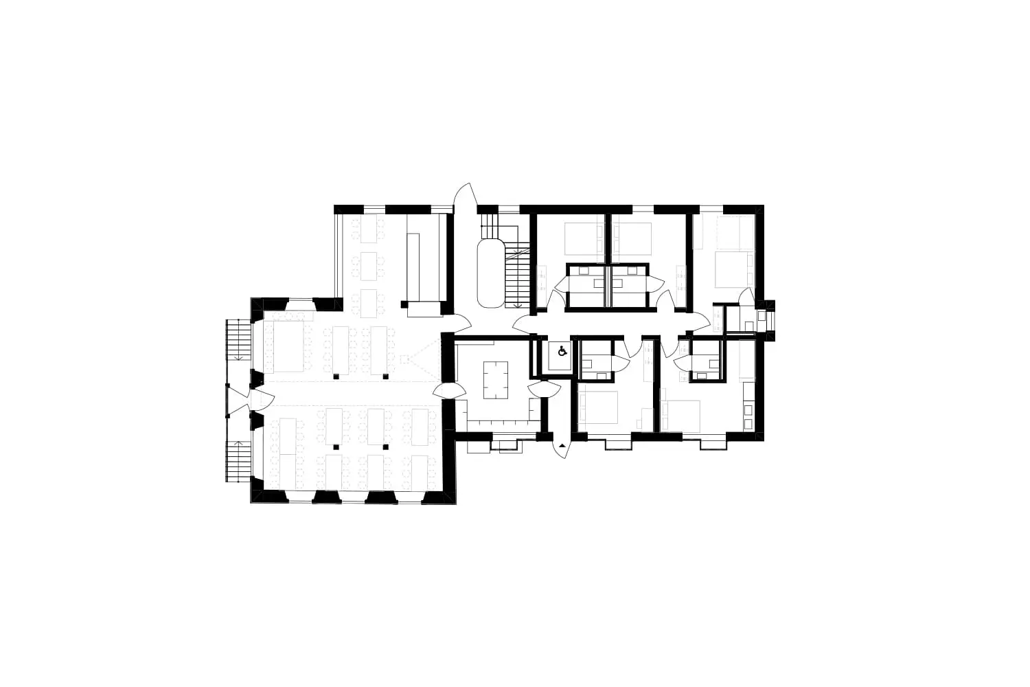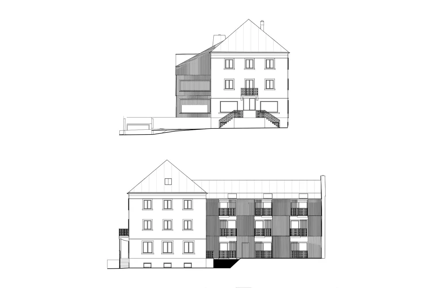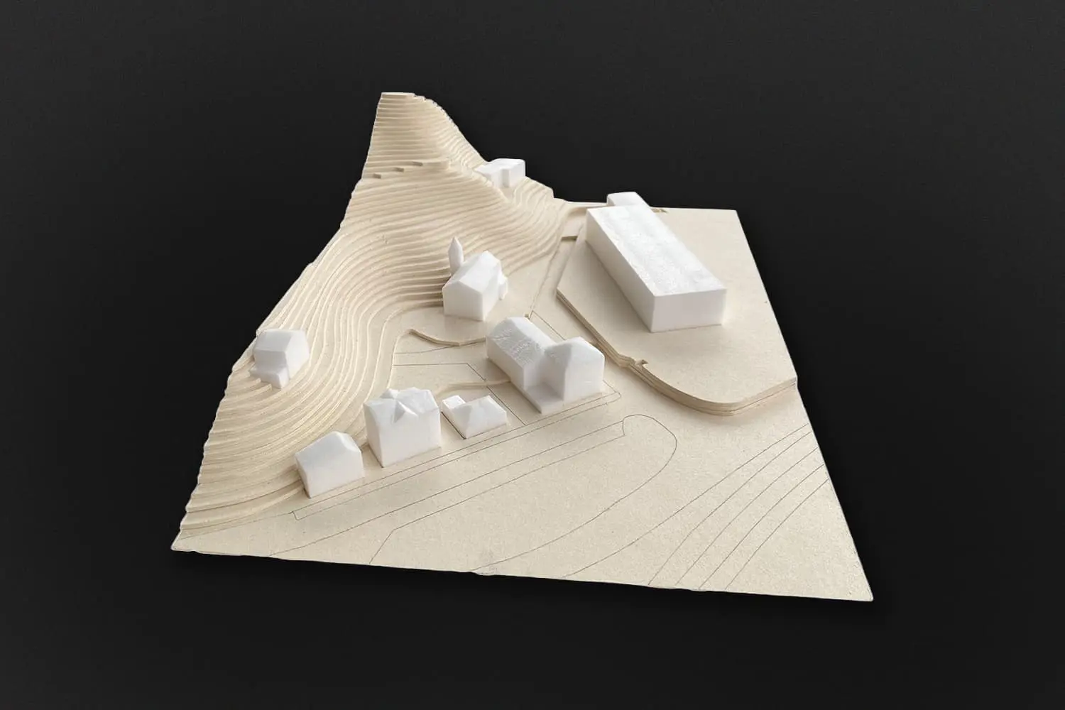 Andermatt liegt als Hochtal nahe der Gipfel und erscheint in unmittelbarer Beziehung zum Himmel. Die alpine Landschaft ist geprägt von grauen und beigen Gesteinen, orange gesprenkelten Felsstrukturen, satten Wiesen und dunklen Tannen. Die Farbigkeit wirkt zurückhaltend und dauerhaft. Bauten reagieren hier auf starke Witterung, grosse Temperaturschwankungen und lange Winter. Der Ort dient gleichermassen der Erholung wie auch sportlichen Nutzungen und besitzt einen eigenständigen Charakter zwischen Passlandschaft und Siedlung. Bestand und Erweiterung werden zu einer zusammenhängenden Einheit geführt. Eine einheitliche Dachhaut und durchgängige Spenglerarbeiten verbinden die Baukörper zu einer gemeinsamen Silhouette. Ein gebrochenes Grün bildet die Grundfarbe beider Volumen und nimmt Bezug auf Vegetation und Gestein. Der Neubau wird durch eine feine Holzlattung differenziert, ohne sich vom Gesamtbild zu lösen. Ziel ist ein Gebäude, das sich über die Jahreszeiten hinweg ruhig in das Ortsgefüge einordnet. Der historische Bestand – das Hotel Altkirch – trotzt seit Jahrzehnten Wind, Schnee und starken Temperaturschwankungen. Seine Präsenz ist Teil der lokalen Erinnerungsschicht und erzählt von der Entwicklung des Passortes als Aufenthalts- und Durchgangsort. Unmittelbar daneben steht eine Kapelle aus dem 11. Jahrhundert, einer der bedeutendsten romanischen Sakralbauten des Kantons Uri. Südlich schliessen militärische Anlagen des 19. Jahrhunderts an. Diese Überlagerung verschiedener Epochen verleiht dem Ort Tiefe und Massstab. Die Erweiterung sucht daher nicht nach Dominanz, sondern nach Anschlussfähigkeit. Historische Motive werden nicht kopiert, sondern in Proportion, Materialwahl und Volumen neu interpretiert. So entsteht ein Gefüge, das Vergangenheit und Gegenwart in ein sachliches Verhältnis setzt. Die Dachlandschaft entwickelt sich aus einfachen geometrischen Körpern. Der bestehende Bau erscheint als klar gefasstes Volumen mit pyramidalem Abschluss, der Anbau als länglicher Quader. Durch die Angleichung der Dachflächen entsteht ein zusammenhängendes Ganzes, das beide Teile lesbar belässt und dennoch verbindet. Die Materialwahl folgt dem rauen Klima des Standorts. Massive Wandaufbauten und mineralische Oberflächen sichern Dauerhaftigkeit. Der Anbau wird in robustem Mauerwerk ausgeführt und mit Putzflächen kombiniert. Metallene Elemente setzen präzise Akzente und strukturieren Öffnungen und Kanten. Das Gebäude versteht sich als ruhiger Körper im Gefüge der Berge – widerstandsfähig, reduziert und im Dialog mit seiner Umgebung.