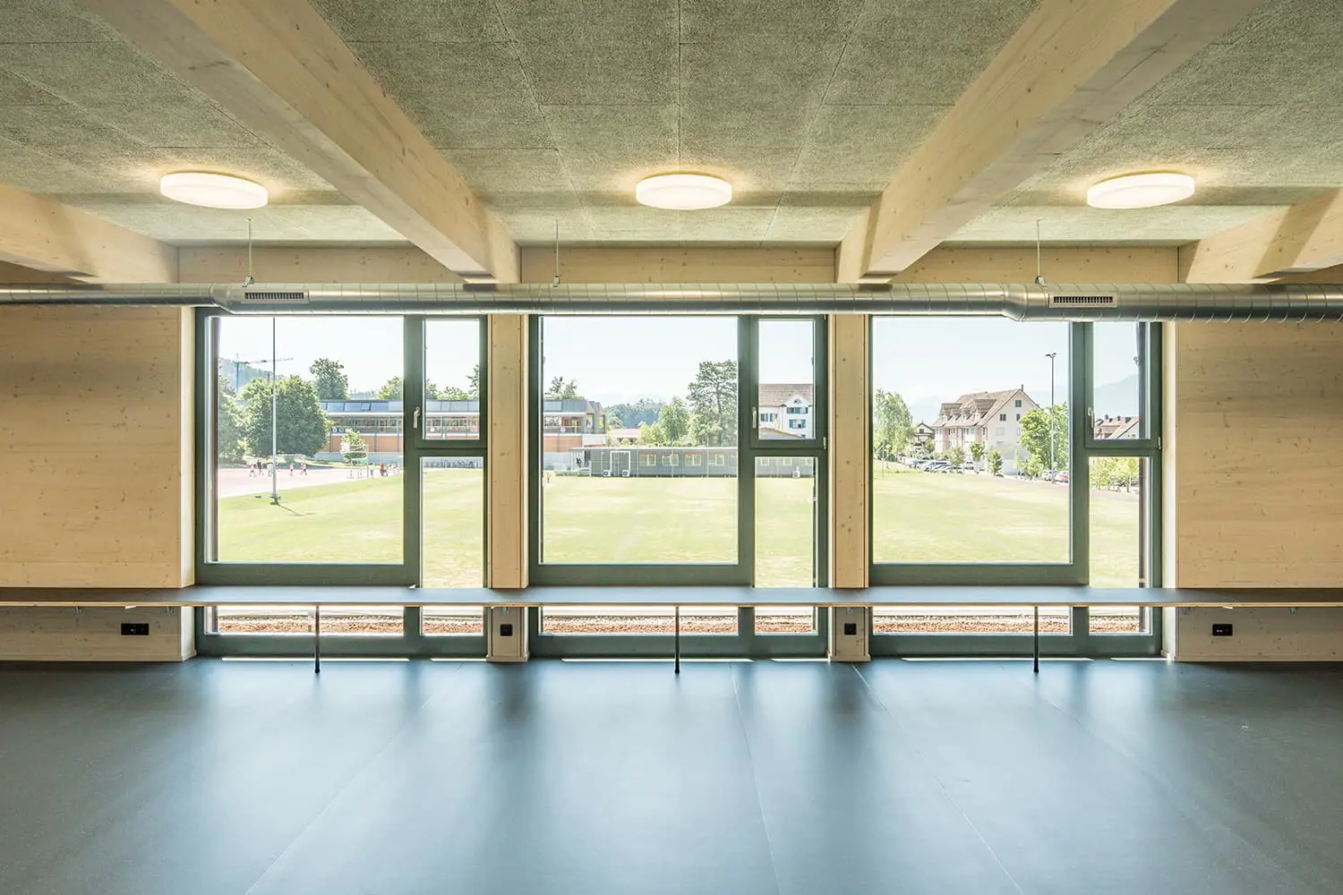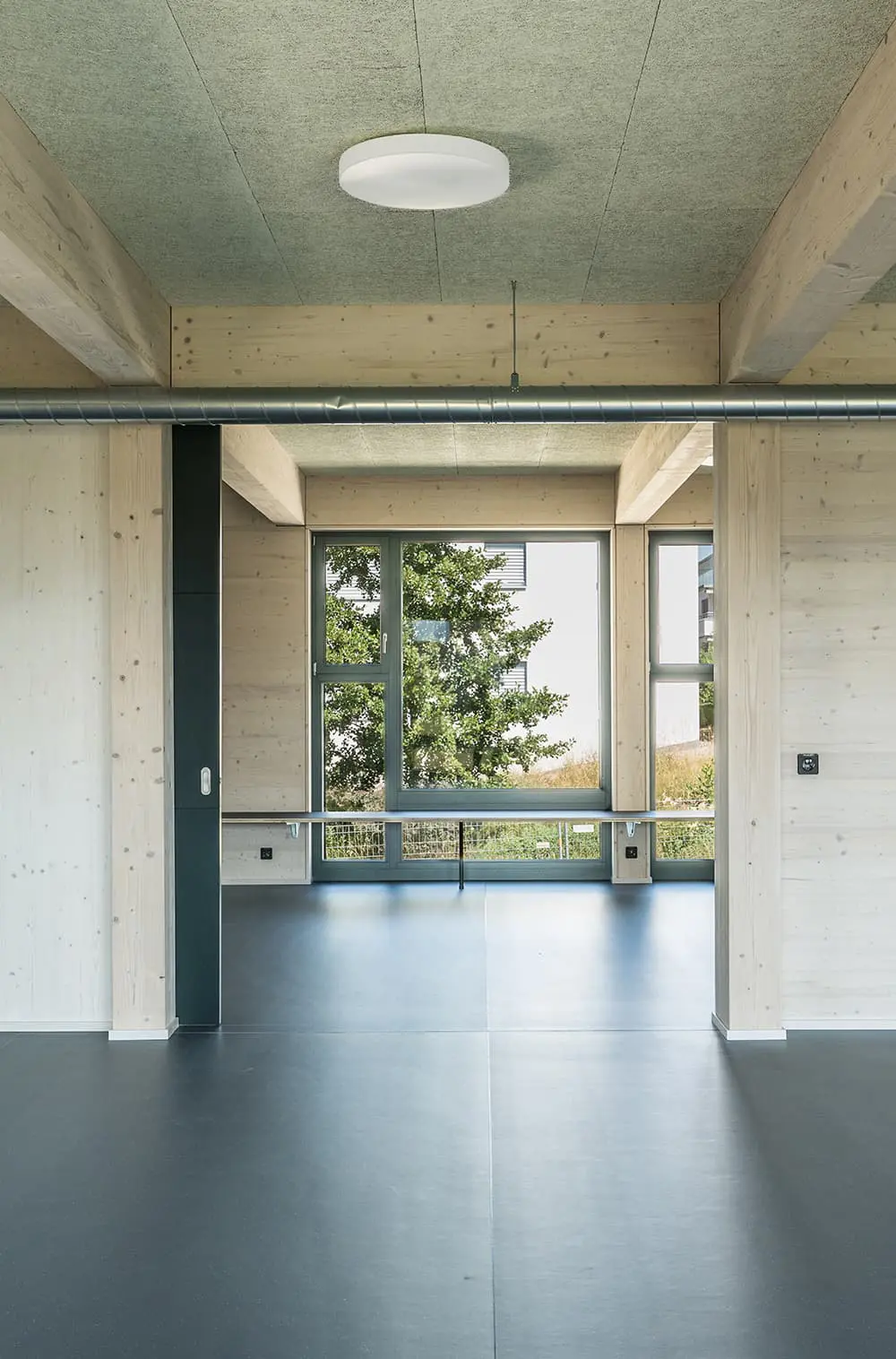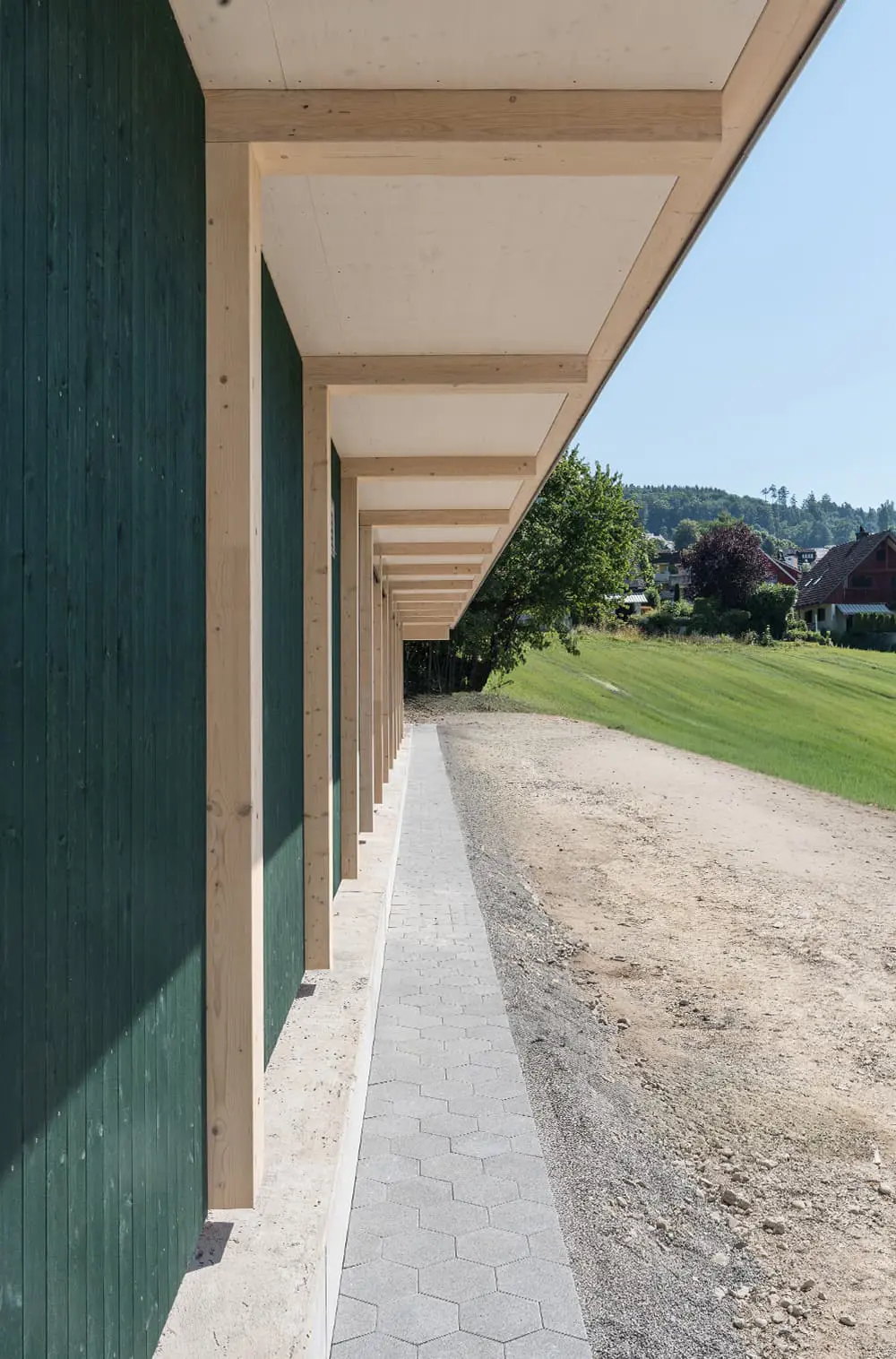 Aufgrund der stark gestiegenen Schülerzahlen in der Gemeinde Mettmenstetten entsteht am nördlichen Rand des bestehenden Schul- und Sportareals ein neues Schulgebäude. Der freistehende Baukörper führt die parkartige Umgebung und den Charakter einer Schule im Park der bestehenden Gebäude fort. Als zweigeschossiger Pavillonbau für Primarschul- und Kindergartenklassen fügt sich der Neubau harmonisch in die Landschaft ein. Die grosszügige Freifläche des angrenzenden Fussballplatzes wird von den Schulräumen genutzt, wobei ein transparentes Netz in die Fassadengestaltung integriert wurde, um auf einen hohen Ballfangzaun verzichten zu können. Die markante Baumgruppe im Osten dient als Orientierungspunkt für den Hauptzugang, der gegenüber dem bestehenden Kindergarten Niederfeld im Osten liegt. Die Topographie zwischen den Schulgebäuden schafft eine natürliche Aussenspielfläche für die Kinder. Die an den Längsfassaden ablesbare Holzkonstruktion des Neubaus gibt dem Gebäude einen erlebbaren Rhythmus. Die grosszügig geplanten Flurflächen dienen nicht nur der Erschliessung, sondern auch als vielseitig nutzbare Schulraumerweiterung. Die Innenraumgestaltung orientiert sich am Thema Bahnhof. Grosszügige Vordächer und auskragende Sonnensegel reduzieren die sommerlichen Wärmelasten und bieten geschützte Aussenräume für Pausen und Unterricht im Freien. Das Gebäude wird nach den Standards der Energiestrategie der Gemeinde Mettmenstetten mit einem Minergie A und Minergie Eco Standard erstellt