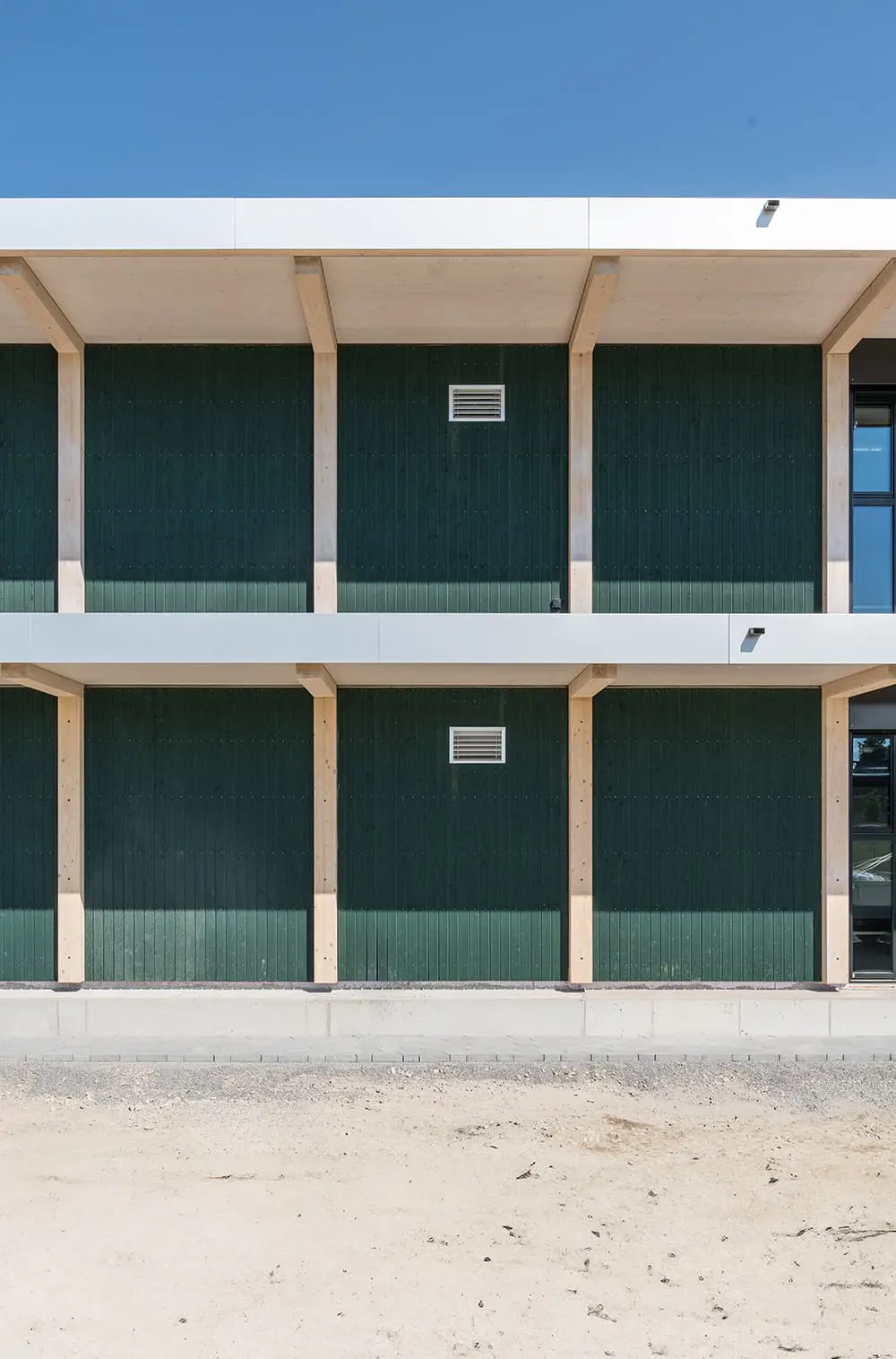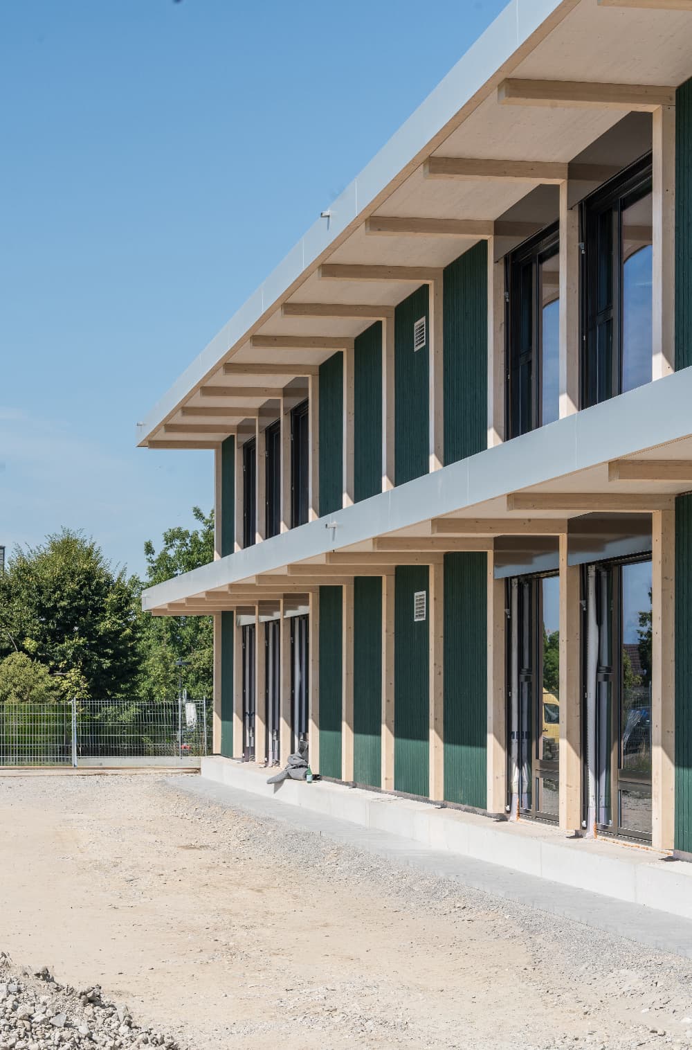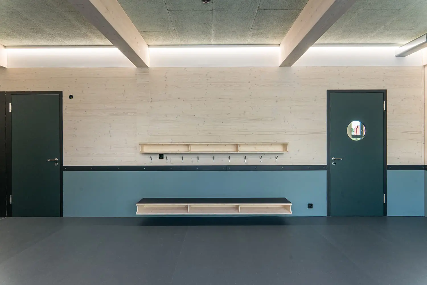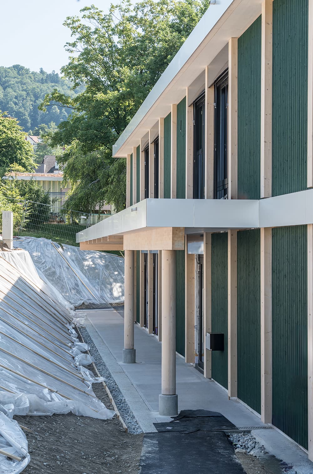 Aufgrund der stark gestiegenen Schülerzahlen in der Gemeinde Mettmenstetten entsteht am nördlichen Rand des bestehenden Schul- und Sportareals ein neues Schulgebäude. Der freistehende Baukörper führt die parkartige Umgebung und den Charakter einer Schule im Park der bestehenden Gebäude fort. Als zweigeschossiger Pavillonbau für Primarschul- und Kindergartenklassen fügt sich der Neubau harmonisch in die Landschaft ein. Die grosszügige Freifläche des angrenzenden Fussballplatzes wird von den Schulräumen genutzt, wobei ein transparentes Netz in die Fassadengestaltung integriert wurde, um auf einen hohen Ballfangzaun verzichten zu können. Die markante Baumgruppe im Osten dient als Orientierungspunkt für den Hauptzugang, der gegenüber dem bestehenden Kindergarten Niederfeld im Osten liegt. Die Topographie zwischen den Schulgebäuden schafft eine natürliche Aussenspielfläche für die Kinder. Die an den Längsfassaden ablesbare Holzkonstruktion des Neubaus gibt dem Gebäude einen erlebbaren Rhythmus. Die grosszügig geplanten Flurflächen dienen nicht nur der Erschliessung, sondern auch als vielseitig nutzbare Schulraumerweiterung. Die Innenraumgestaltung orientiert sich am Thema Bahnhof. Grosszügige Vordächer und auskragende Sonnensegel reduzieren die sommerlichen Wärmelasten und bieten geschützte Aussenräume für Pausen und Unterricht im Freien. Das Gebäude wird nach den Standards der Energiestrategie der Gemeinde Mettmenstetten mit einem Minergie A und Minergie Eco Standard erstellt