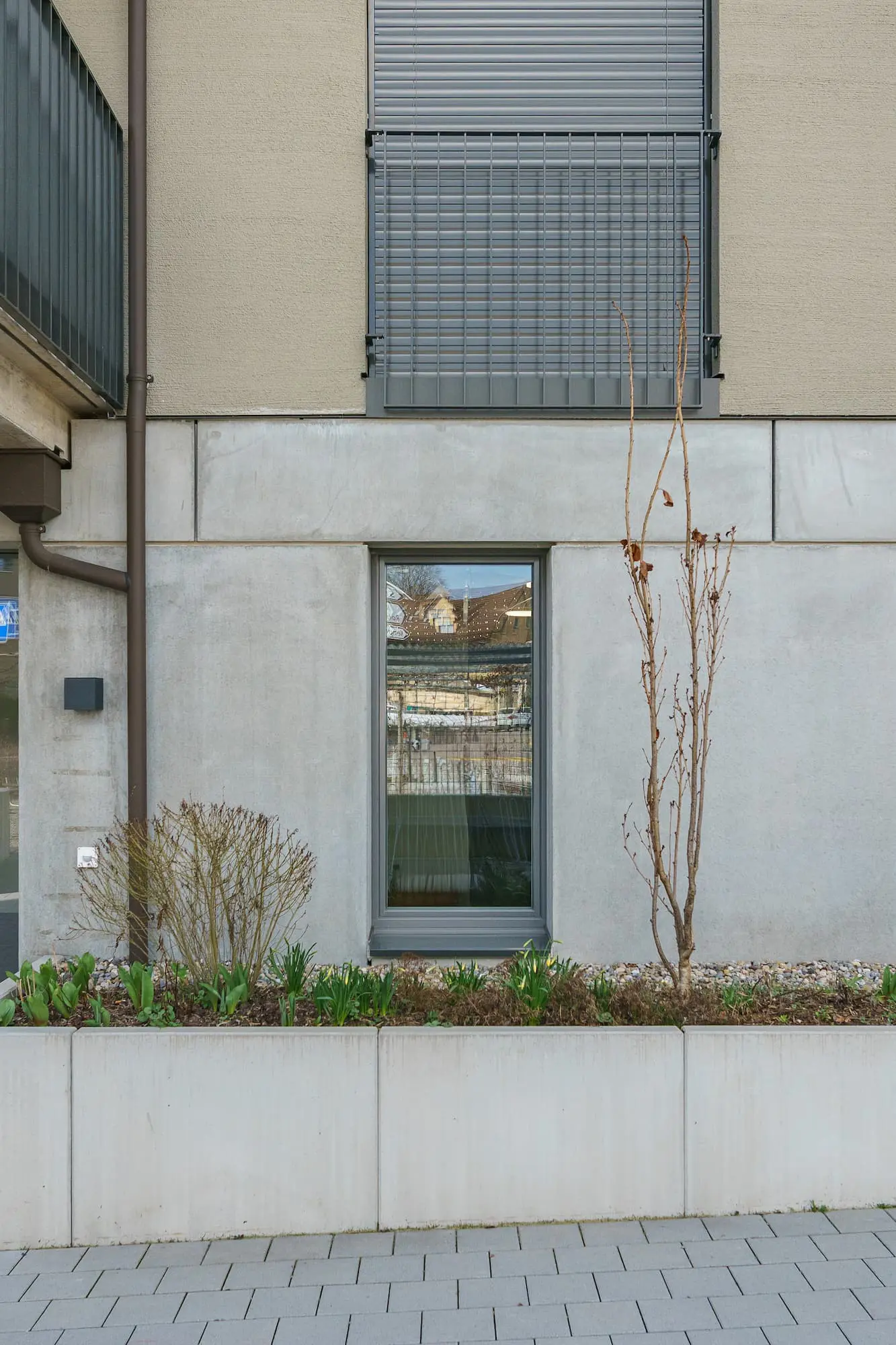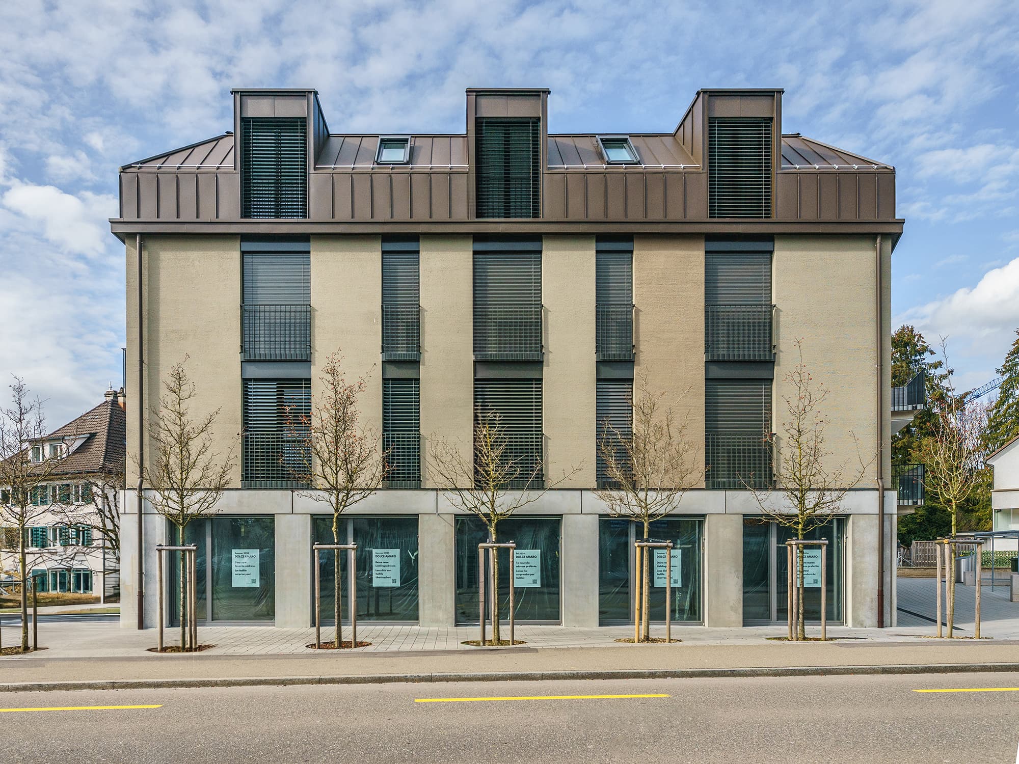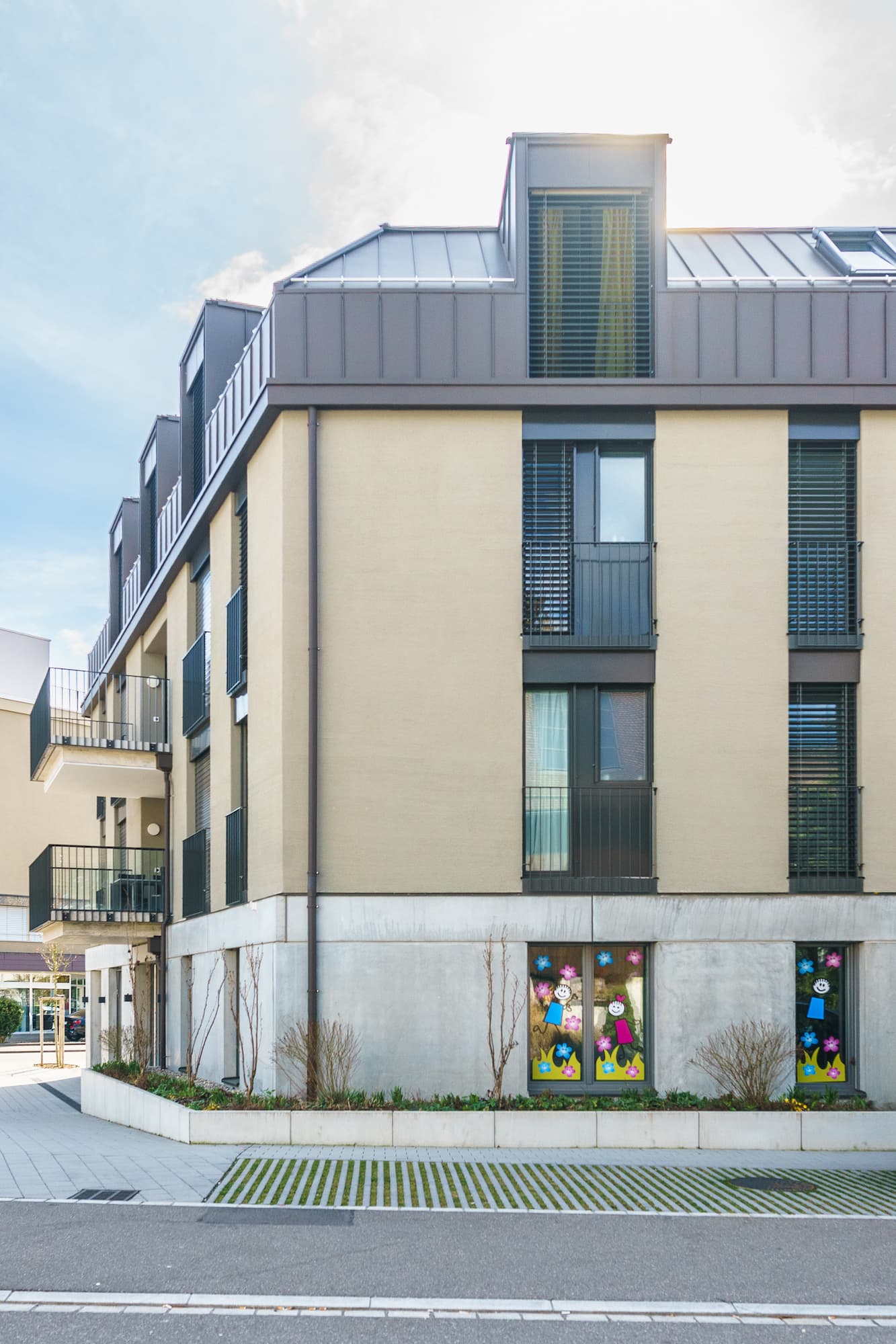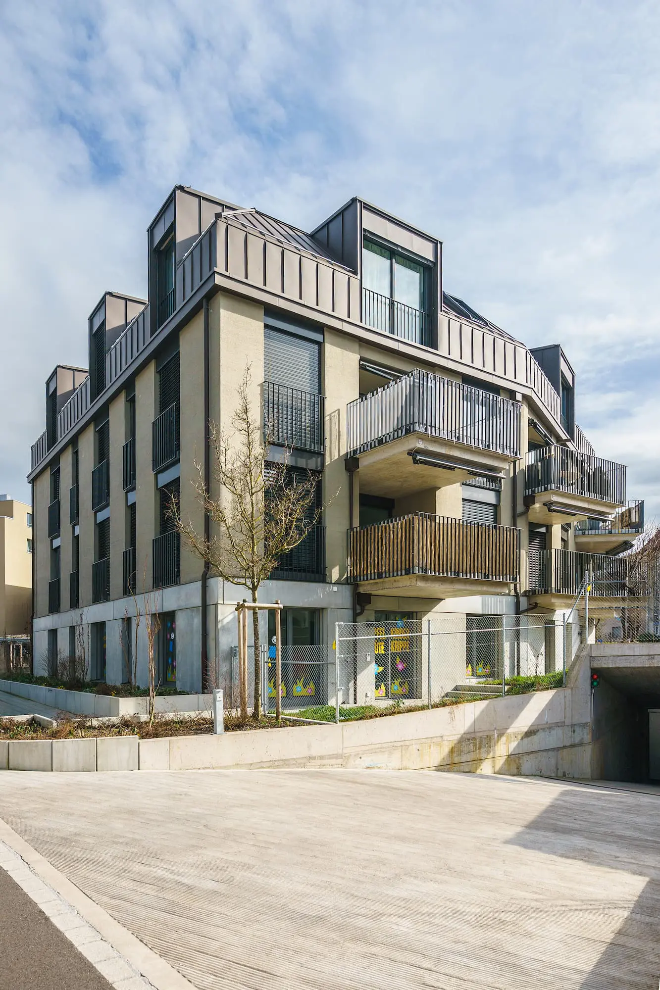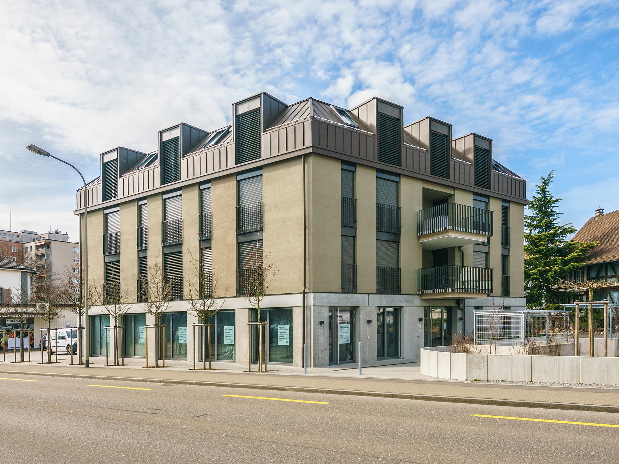 Die längste Bahnhofstrasse Europas verbindet den Bahnhof Wetzikon mit dem Ortsteil Kempten. Den nördlichen Schlusspunkt der Bahnhofstrasse bildet das historische Restaurant Ochsen. In direktem Sichtbezug zum Restaurant Ochsen direkt an der Bahnhofstrasse liegt ein interessantes dreieckiges Grundstück, auf dem früher die Poststelle Kempten und später ein Sportgeschäft betrieben wurde. Neu entsteht dort ein Wohn- und Gewerbegebäude mit einer kompakten Form, die direkt an der Strassenkreuzung einen Freiraum freispielt. Der öffentliche Charakter dieses Orts im Herzen Kemptens wird dadurch verstärkt. Die heterogene Siedlungsstruktur entlang der Bahnhofstrasse erhält zudem einen baulichen Abschluss, ähnlich eines Kopfbaus. Der Haupteingang des Neubaus befindet sich gut erkennbar auf der prominenten Ostseite, visavis des bekannten Ochsenkreisels. Die Fassaden- und Dachgestaltung sucht einen Bezug zu den städtebaulich prägenden Gebäuden aus der Gründerzeit entlang der Bahnhofstrasse und wird mit 3 Vollgeschossen und einem Mansardengeschoss diesem urban exponierten Ort gerecht. Zudem stellt sie durch eine klassische Teilung mit massivem, öffentlich orientierten Sockel, einem Hauptteil mit optisch zwei zusammengefassten Geschossen und einer klaren horizontalen Traufkante mit Dachgeschoss, den Bezug zu den älteren dreigeschossigen Kernzonenbauten her. Zwei kleine Wohnungen sind nach Osten zum städtischeren Raum orientiert, die meisten Wohnungen richten sich jedoch strassenabgewandt nach Westen aus. Zwei grössere Wohnungen im Dachgeschoss werden durch einen grosszgügigen und intimen Aussenraum ergänzt, der räumlich als Fortsetzung des Innenraums wirkt. Im Erdgeschoss bereichert eine Kindertagesstätte mit einem Aussenspielbereich auf Hochparterreebene und ein Kleingewerbe entlang der Bahnhofstrasse die Hausgemeinschaft. Der Freiraum im Osten bildet mit einer niedrigen Umfassungsmauer und dem Blätterdach der Schirmplatanen einen Ort mit interessanter räumlicher Qualität. Wie ein schmucker Hochgarten, von denen es einige schöne Beispiele entlang der Bahnhofstrasse gibt, soll dieser leicht erhöhte Platz mit einem kleinen Kinderspielbereich ein attraktiver Ort der Begegnung oder des Rückzugs bilden, wo sich Bewohner, Besucher und Passanten aufhalten können.
