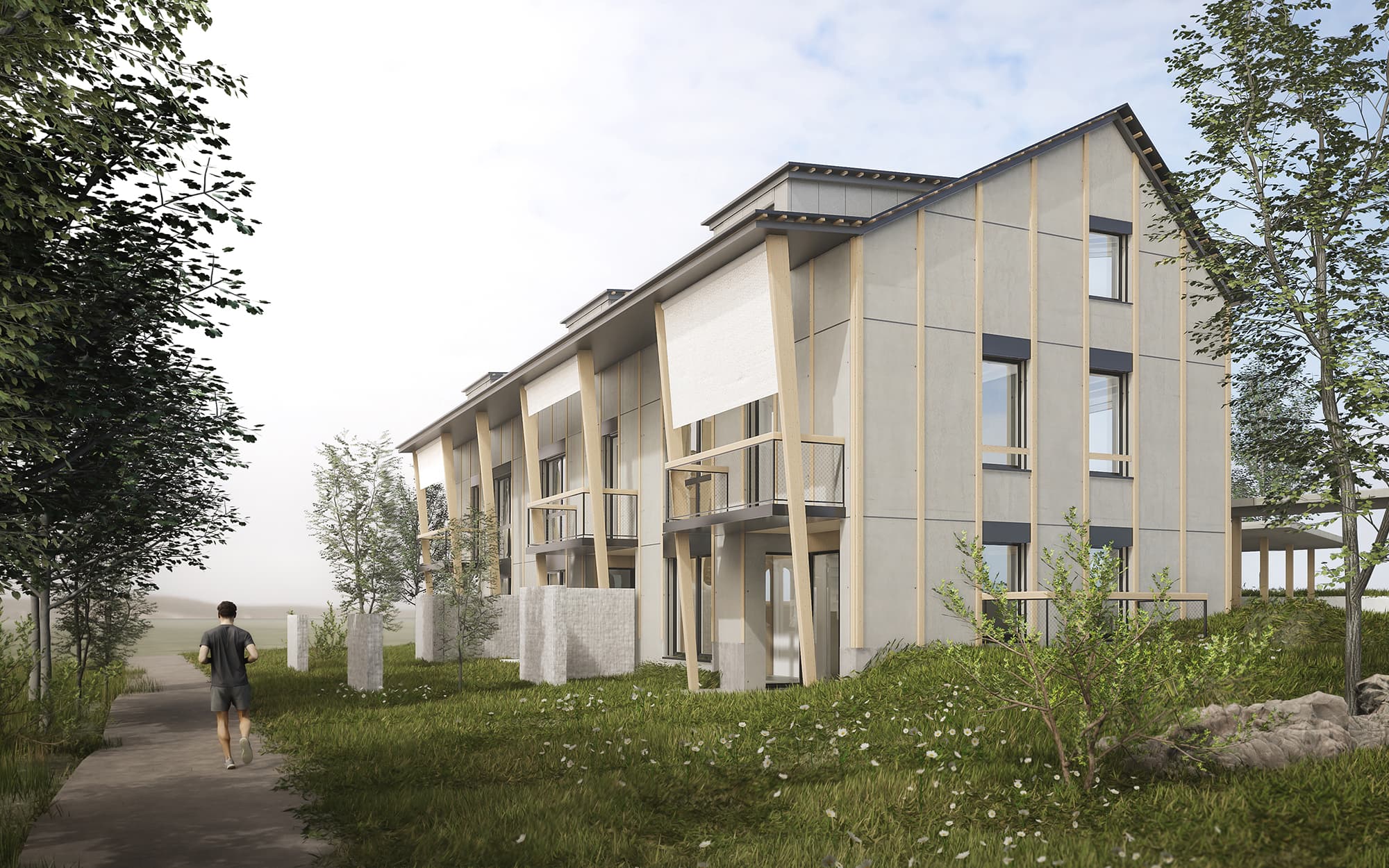 Das Gebäude ist eingebettet in eine Umgebung, die durch strukturierte Grünflächen, locker gesetzte Strauchgruppen und ein klar geführtes Wegsystem geprägt ist. Klar zonierte Sitzplätze, ergänzt durch Blumenwiesen und Pflanzbereiche, vermitteln zwischen gebautem Raum und der umgebenden Landschaft. Der Bau ruht auf einem kräftigen Sockel aus Ortbeton, der sich ab der Erdgeschossdecke in einer präzise gefügten Holzkonstruktion weiter in die Höhe entwickelt. Die Fassade aus vertikaler Holzschalung, gegliedert durch fein rhythmisierte Lisenen, lässt die Konstruktion ablesbar werden und verleiht dem Haus eine ruhige Erscheinung. Großzügig auskragende Vordächer definieren geschützte Schwellenräume zwischen Innen und Außen und formulieren eine einladende Geste. Im Inneren bestimmen sichtbare Fichtenholzflächen und eine sorgfältige Raumgliederung das Bild. Die Grundrisse sind funktional durchdacht, ermöglichen aber gleichzeitig differenzierte Nutzungen und atmosphärische Tiefe. Holzrahmenkonstruktionen und natürliche Materialien erzeugen eine warme, zurückhaltende Wohnlichkeit, unterstützt durch Massivparkettböden, Holztreppen und einfache, haptisch angenehme Oberflächen. Die Gebäudetechnik ist zurückhaltend integriert und auf Langlebigkeit ausgerichtet: Eine zentrale Wärmepumpe mit Erdsonden sowie eine Photovoltaikanlage nach aktuellem Standard sichern eine zeitgemäße, ressourcenschonende Energieversorgung. Die Gesamtkomposition überzeugt durch eine konsequente Verbindung von Gestaltung, Funktion und Nachhaltigkeit – ein stilles, aber ausdrucksstarkes Haus, das sich selbstbewusst und selbstverständlich in seinen Kontext einfügt.