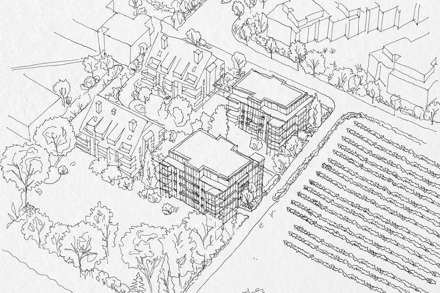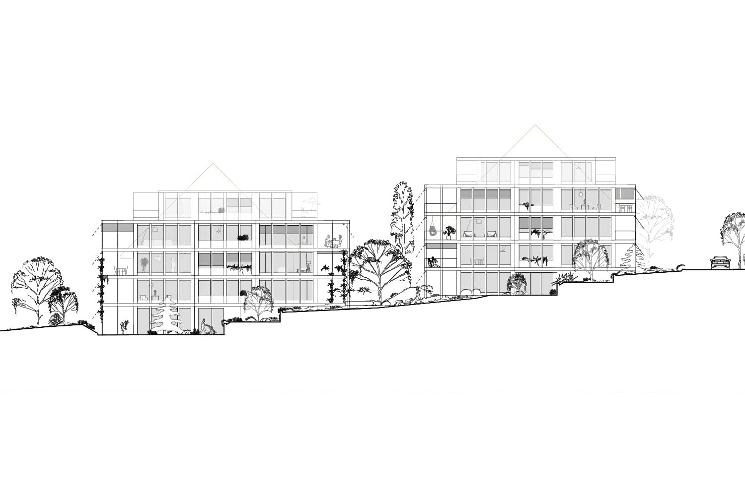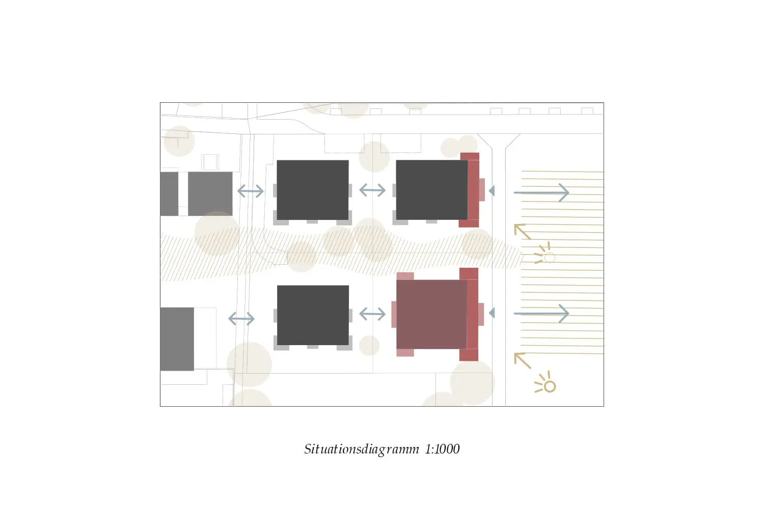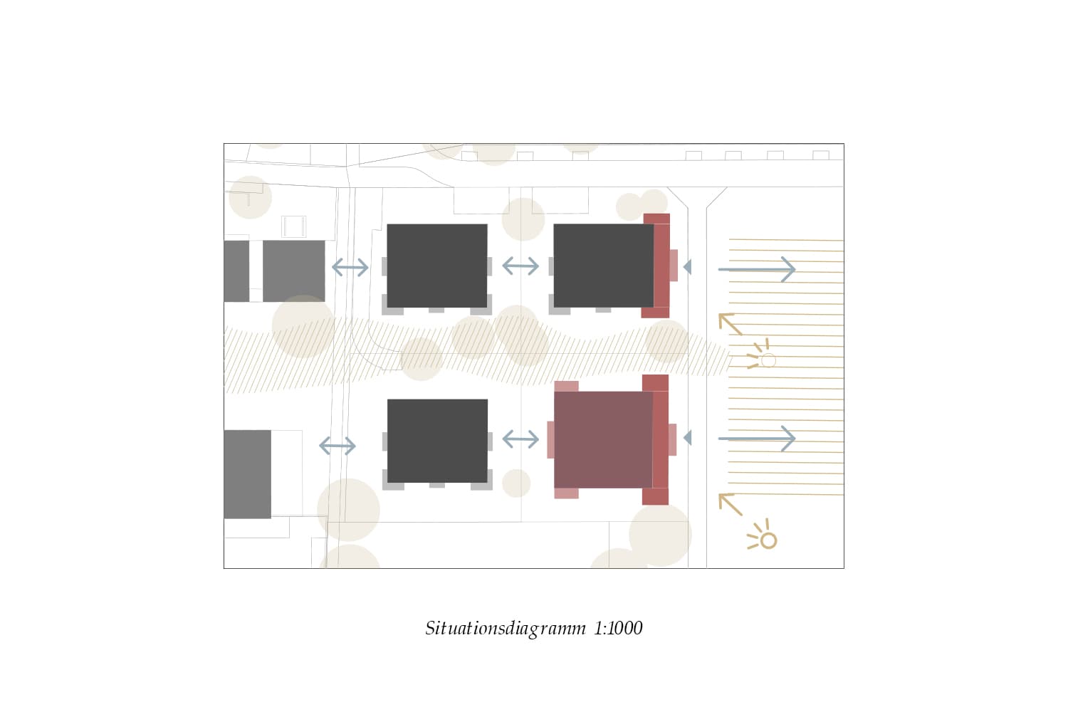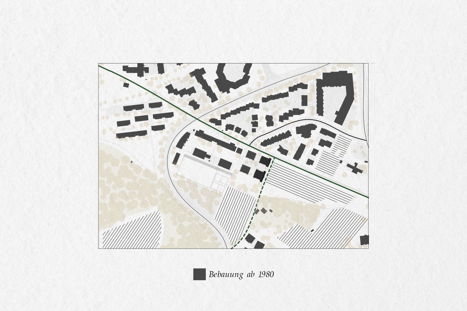 Die Giblenstrasse ist seit den 1920er-Jahren als Verbindung durch die landwirtschaftlich geprägte Hanglandschaft von Höngg belegt. Rebhänge, Felder und der Frankenbühlwald prägen bis heute den Übergang zwischen Siedlung und Kulturlandschaft und verleihen dem Ort eine eigenständige räumliche Identität. Das bestehende Wohnensemble aus den 1980er-Jahren wird in seiner Grundstruktur erhalten und gezielt weiterentwickelt. Die Eingriffe reagieren auf die Topografie und stärken den Bezug zur umliegenden Landschaft. Zentrale Massnahme ist die Ergänzung einer verglasten Raumschicht an der Ostseite, die den Gebäuden neue Sonnenzimmer hinzufügt und die Wohnungen zum Landschaftsraum öffnet. Ergänzend dazu werden bestehende Fassaden präzise geöffnet und konstruktiv verstärkt, um Alt und Neu räumlich zu verbinden. Die Aufstockung erfolgt in leichter Bauweise, vorzugsweise in Holz, um die zusätzliche Belastung der bestehenden Struktur gering zu halten. Neue Bauteile fügen sich zurückhaltend ein und machen die Eingriffe ablesbar. Grundrisse und Erschliessungen bleiben in ihrer Logik erhalten und werden an heutige Anforderungen angepasst. Der Umbau schont die vorhandene Substanz, reduziert den Materialeinsatz und führt das Ensemble mit klaren, dauerhaften Mitteln weiter.