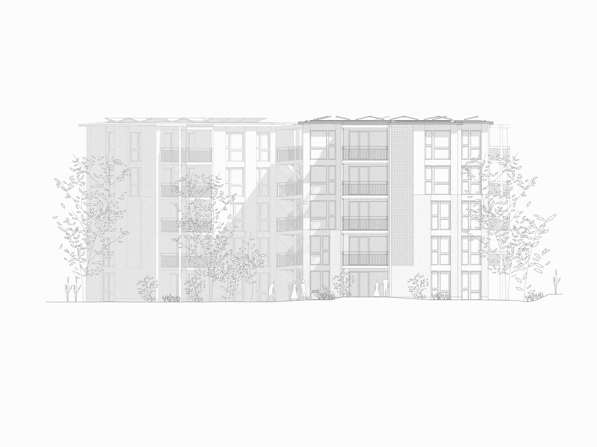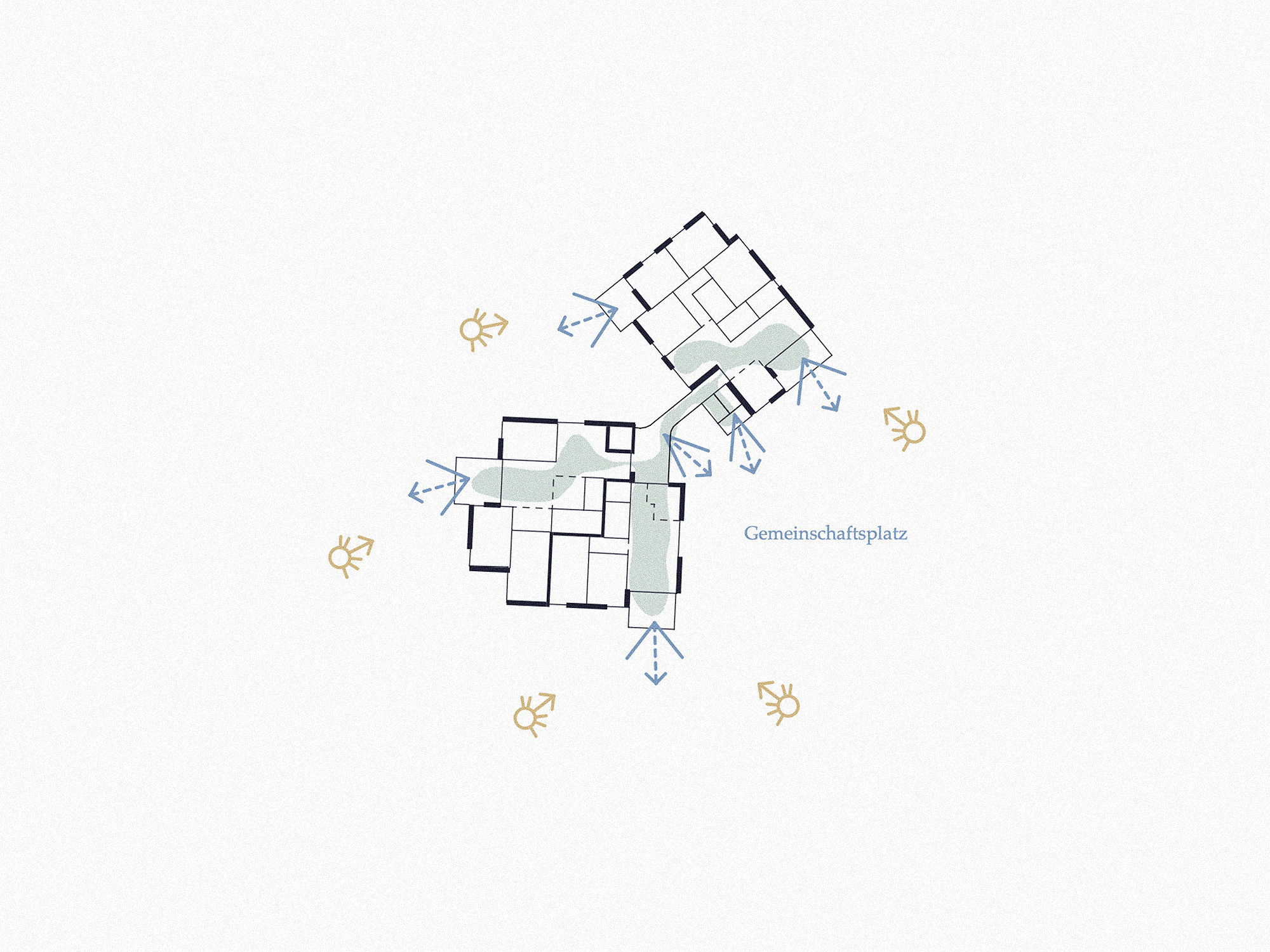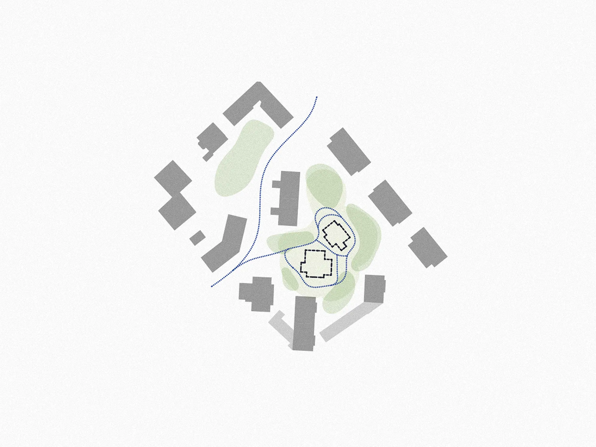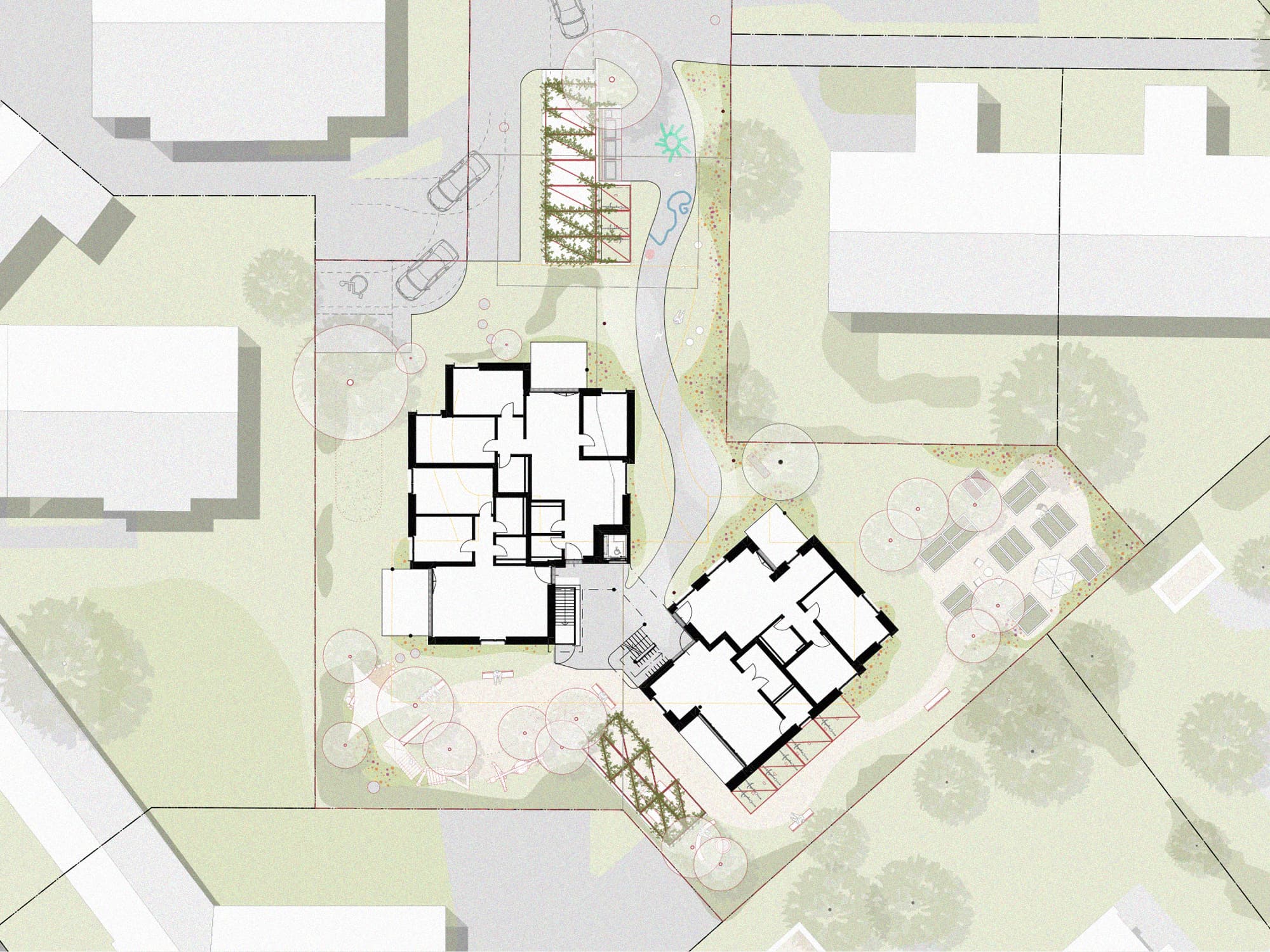 Die Stadt Dübendorf sieht im Flugfeldquartier die Erhaltung von Grün- und Hofräumen vor. Der Projektperimeter befindet sich zentral in einem solchen Grünraum. Der Vorschlag unterstreicht die Bewahrung dieser Qualitäten im Flugfeldquartier. Grünflächen und Oberflächen gehen nahtlos ineinander über, das Wegenetz wird fortgeführt und schafft informelle Treffpunkte. Eine lockere Körnung und präzise Platzierung der Neubauten gewähren den Grün- und Freiräumen Luft. Der südliche Neubau ist etwas grösser dimensioniert und korrespondiert so mit den angrenzenden massiveren Nachbargebäuden und dem Karree. Auch das nördliche Gebäude fügt sich zurückhaltend in die Umgebung ein und orientiert sich an der Gebäudezeile entlang des Flugfeldes. Körnung, Form und Positionierung der beiden Ersatzneubauten erinnern an die Zeitzeugen der Gründerzeitvillen mit ihren grosszügigen Gärten in der näheren Umgebung. Das bestehende Wegenetz wird auf dem Projektareal fortgeführt. Die Flächen gehen nahtlos ineinander über und schaffen informelle Begegnungs- und Aufenthaltsorte für Bewohner und Nachbarn. Das primäre und sekundäre Wegenetz auf dem Areal verläuft entlang der Parzellengrenzen, um und zwischen den Häusern. Eine erlebnisreiche Durchwegung und Zirkulation schaffen Abwechslung, Erholung und fördern die Gemeinschaft innerhalb des Areals sowie in der Nachbarschaft. Die beiden Neubauten begegnen dem ankommenden Besucher mit einer einladenden Geste. Die äussere Erschliessung präsentiert sich offen und einladend. Das Treppenhaus und die Wohnungseingänge dienen als Drehscheibe und zentrale Wohnfunktion mit starkem Aussenbezug zu den Grün- und Freiräumen. Die Brücken, die die Gebäude miteinander verbinden, sind ein Ort der Gemeinschaft, der Aussicht und eine Plattform der Ruhe. Die Gebäude sind wohlproportioniert und schlank und fügen sich optimal in den grünen Hofraum des Gevierts ein. Die vertikale Gliederung der Fassaden setzt die Gebäude in Szene.