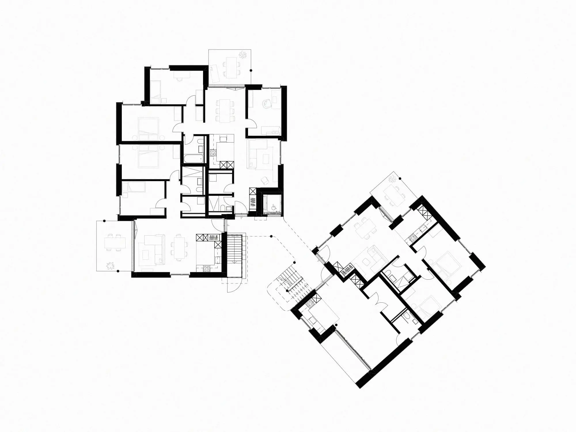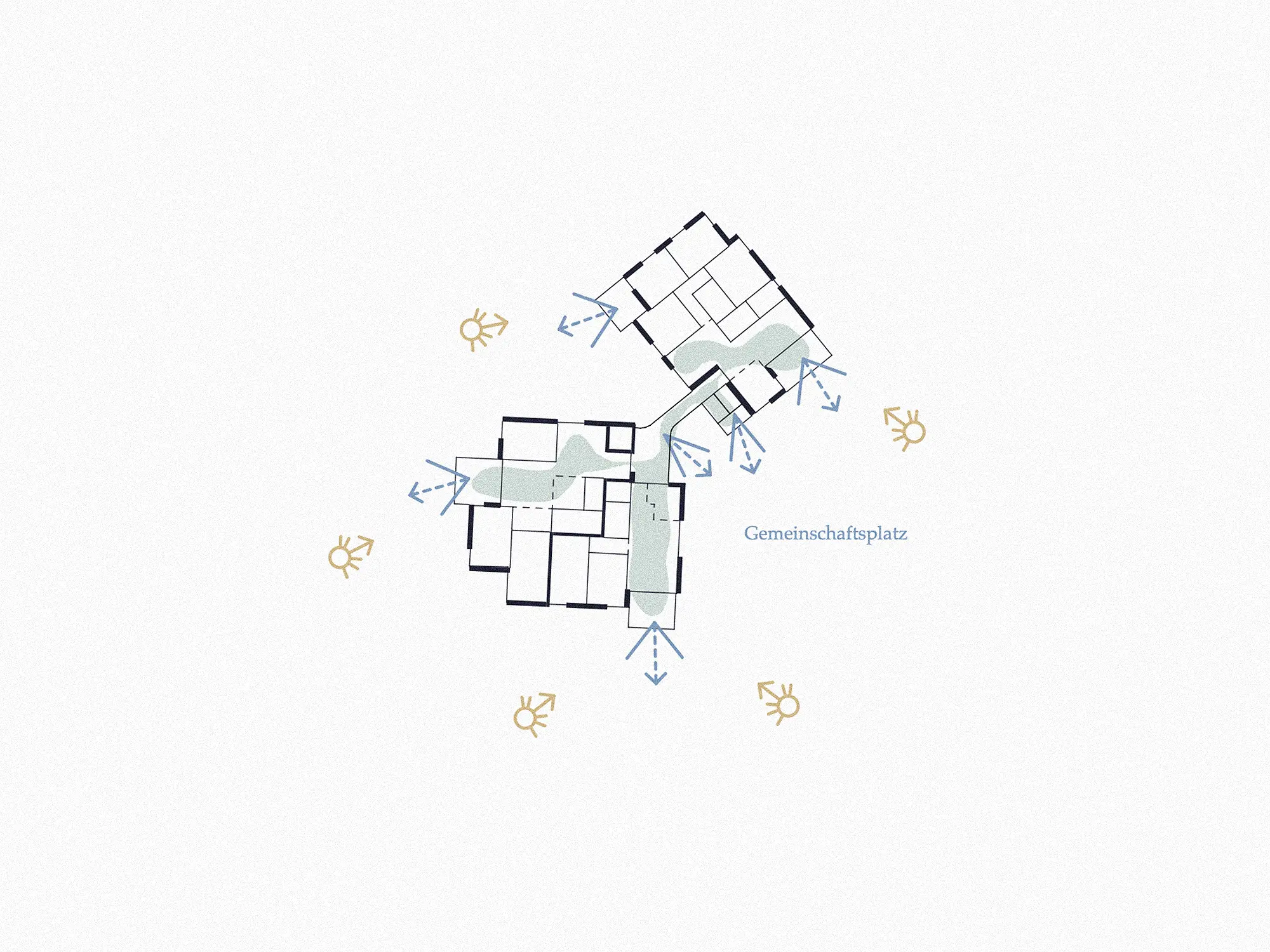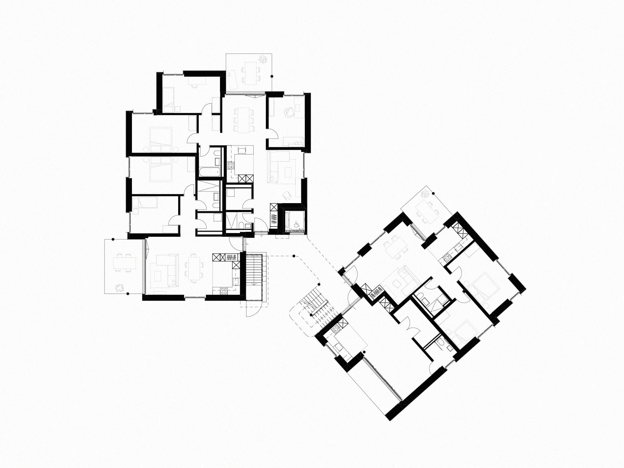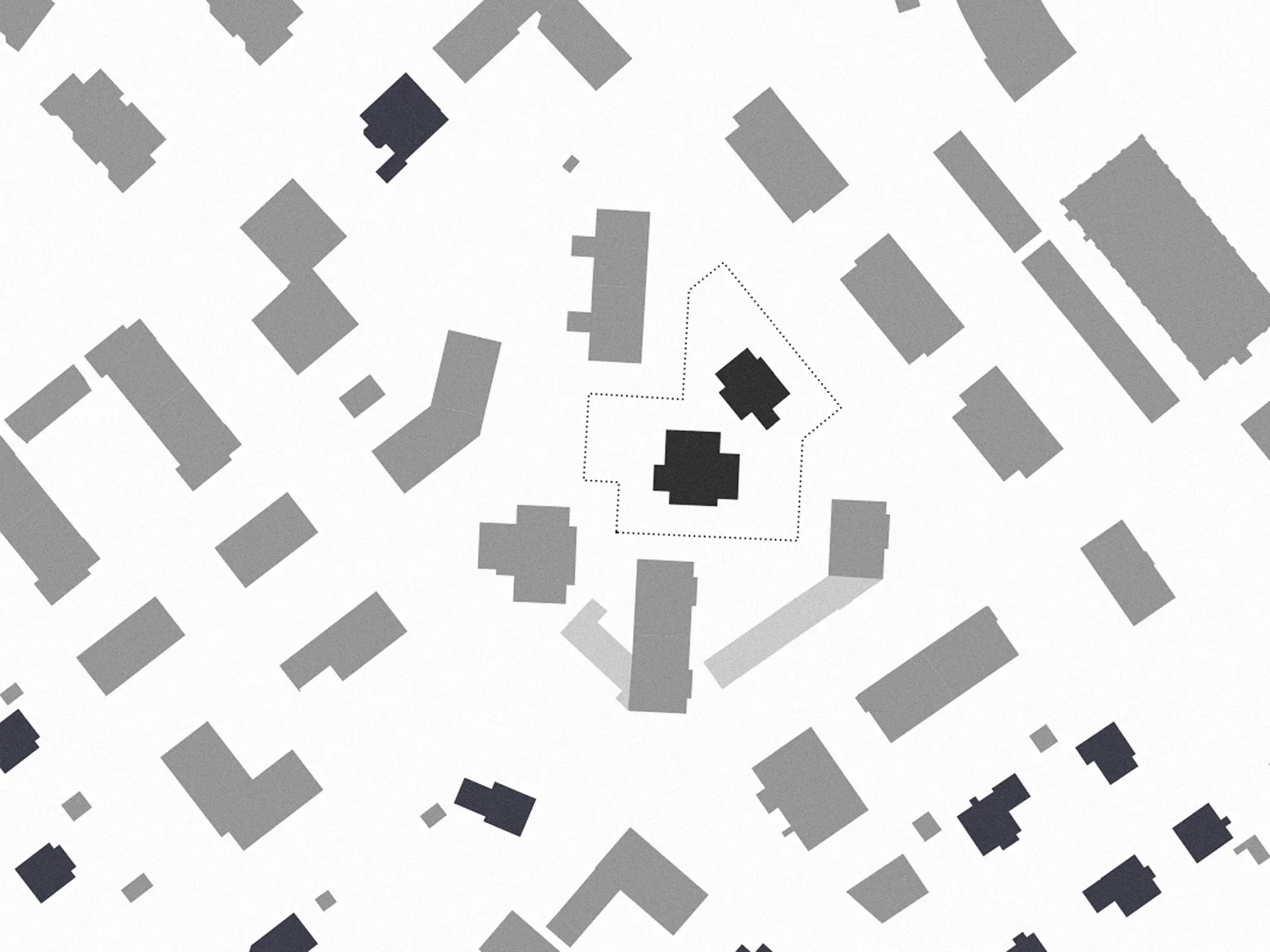 Die Stadt Dübendorf sieht im Flugfeldquartier die Erhaltung von Grün- und Hofräumen vor. Der Projektperimeter befindet sich zentral in einem solchen Grünraum. Der Vorschlag unterstreicht die Bewahrung dieser Qualitäten im Flugfeldquartier. Grünflächen und Oberflächen gehen nahtlos ineinander über, das Wegenetz wird fortgeführt und schafft informelle Treffpunkte. Eine lockere Körnung und präzise Platzierung der Neubauten gewähren den Grün- und Freiräumen Luft. Der südliche Neubau ist etwas grösser dimensioniert und korrespondiert so mit den angrenzenden massiveren Nachbargebäuden und dem Karree. Auch das nördliche Gebäude fügt sich zurückhaltend in die Umgebung ein und orientiert sich an der Gebäudezeile entlang des Flugfeldes. Körnung, Form und Positionierung der beiden Ersatzneubauten erinnern an die Zeitzeugen der Gründerzeitvillen mit ihren grosszügigen Gärten in der näheren Umgebung. Das bestehende Wegenetz wird auf dem Projektareal fortgeführt. Die Flächen gehen nahtlos ineinander über und schaffen informelle Begegnungs- und Aufenthaltsorte für Bewohner und Nachbarn. Das primäre und sekundäre Wegenetz auf dem Areal verläuft entlang der Parzellengrenzen, um und zwischen den Häusern. Eine erlebnisreiche Durchwegung und Zirkulation schaffen Abwechslung, Erholung und fördern die Gemeinschaft innerhalb des Areals sowie in der Nachbarschaft. Die beiden Neubauten begegnen dem ankommenden Besucher mit einer einladenden Geste. Die äussere Erschliessung präsentiert sich offen und einladend. Das Treppenhaus und die Wohnungseingänge dienen als Drehscheibe und zentrale Wohnfunktion mit starkem Aussenbezug zu den Grün- und Freiräumen. Die Brücken, die die Gebäude miteinander verbinden, sind ein Ort der Gemeinschaft, der Aussicht und eine Plattform der Ruhe. Die Gebäude sind wohlproportioniert und schlank und fügen sich optimal in den grünen Hofraum des Gevierts ein. Die vertikale Gliederung der Fassaden setzt die Gebäude in Szene.
