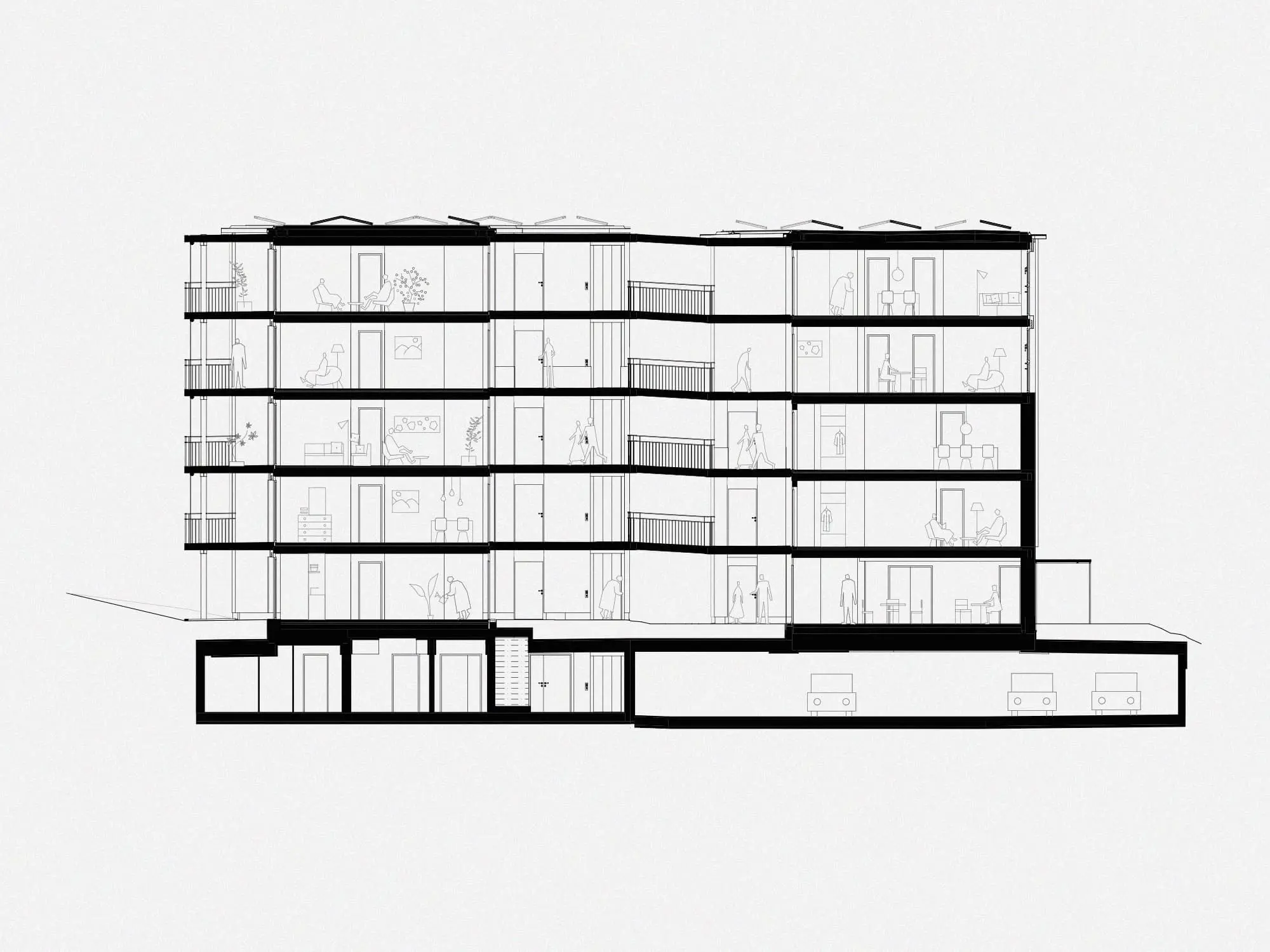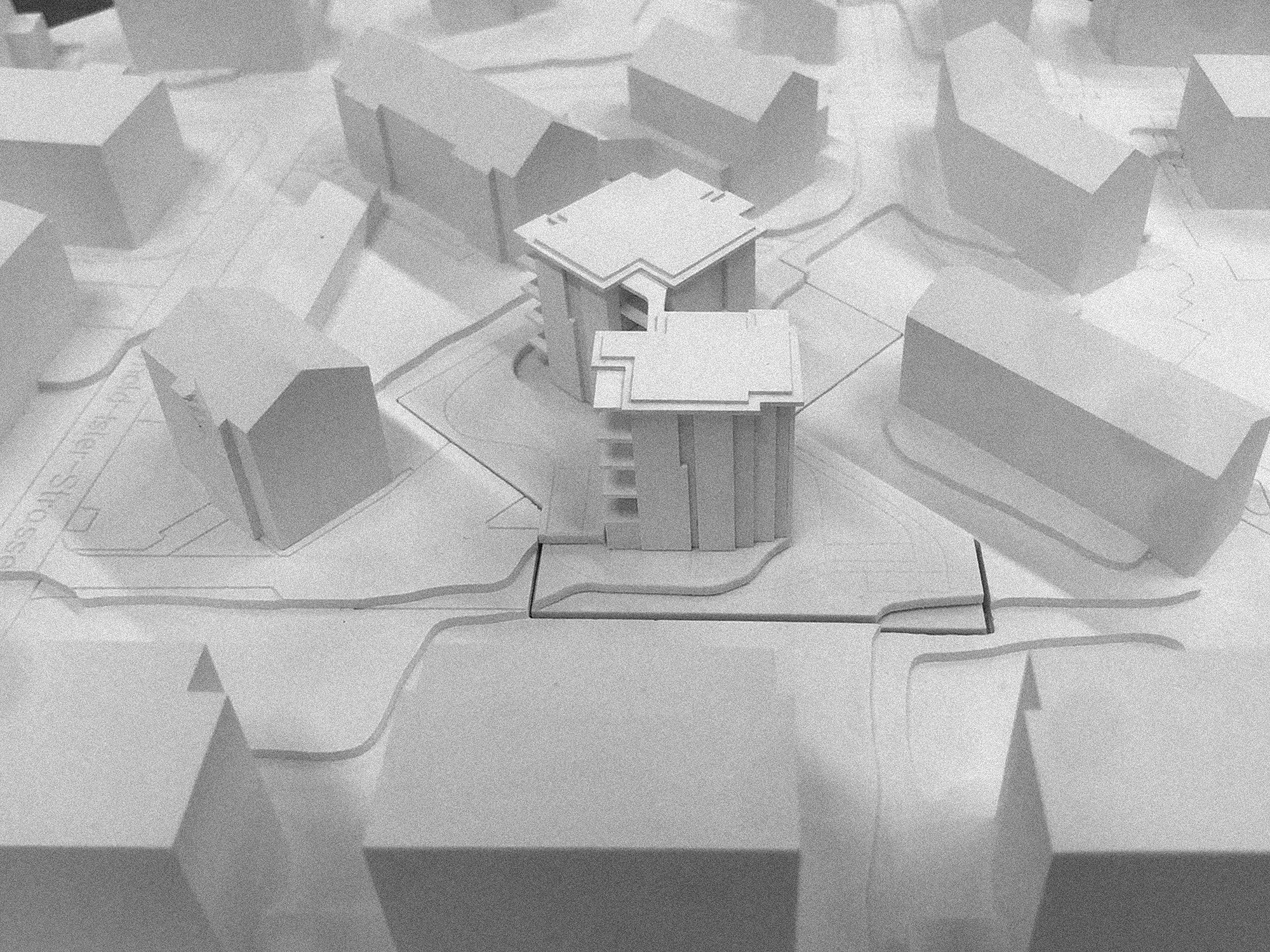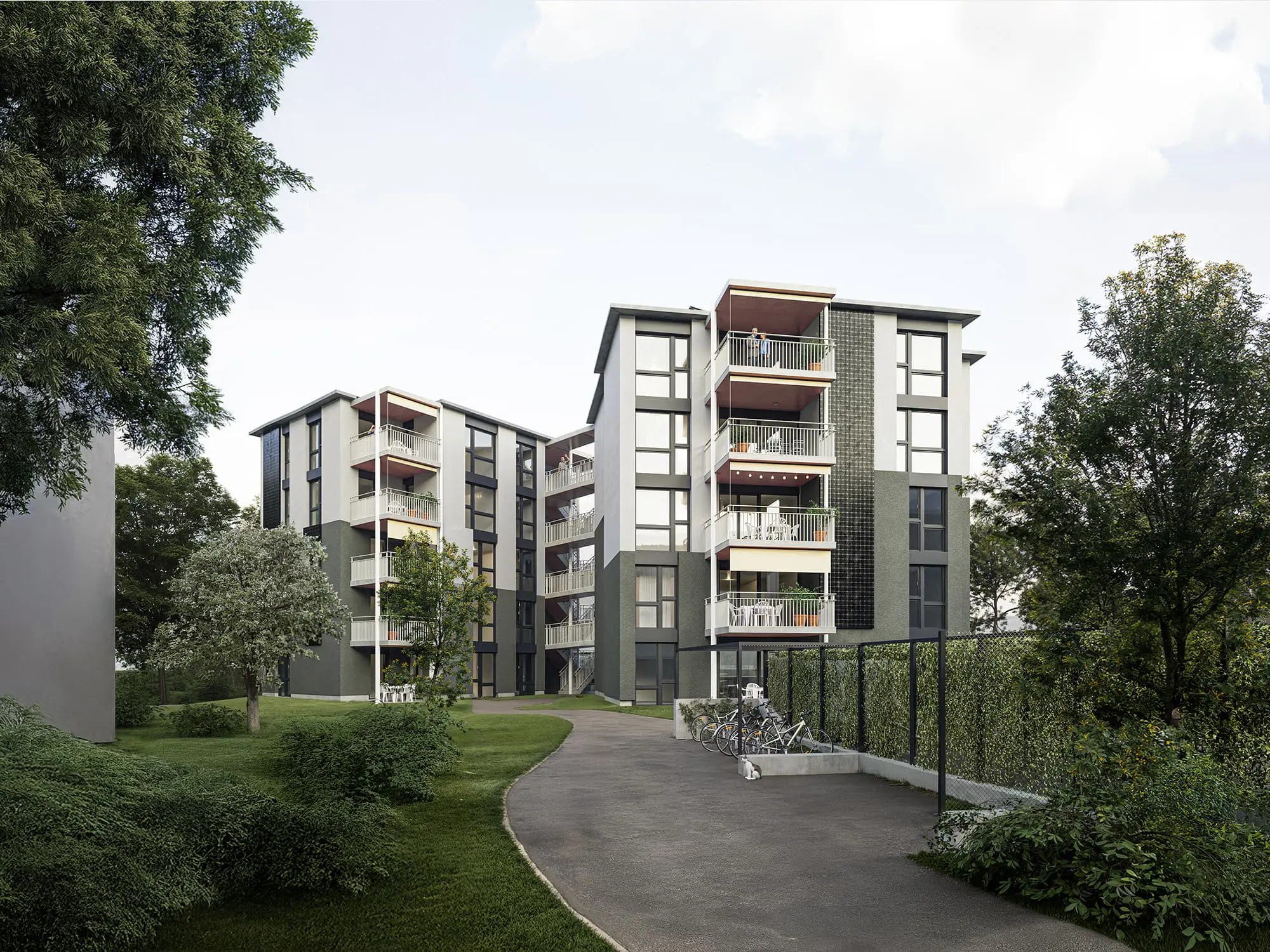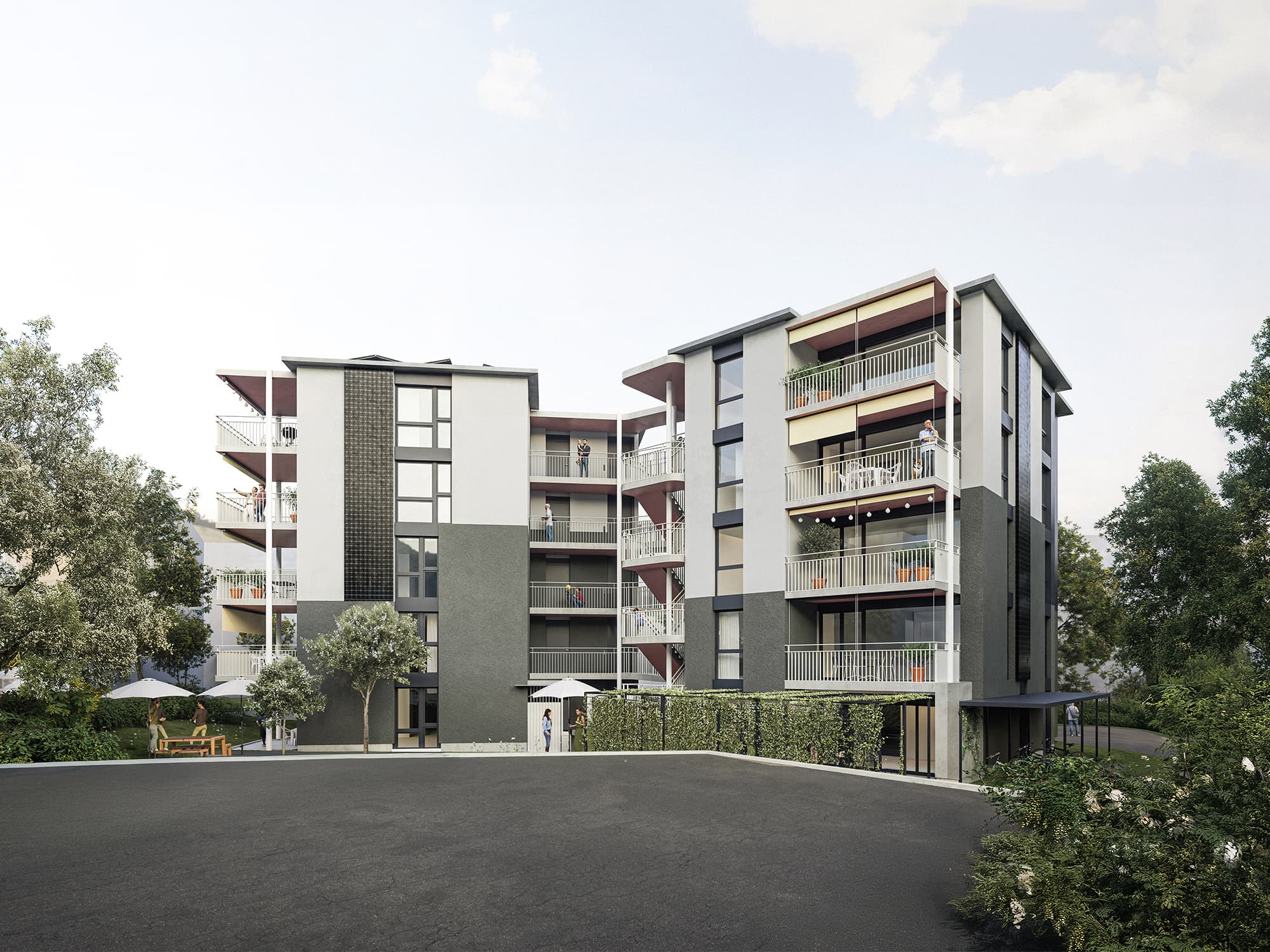 Die Stadt Dübendorf sieht im Flugfeldquartier die Erhaltung von Grün- und Hofräumen vor. Der Projektperimeter befindet sich zentral in einem solchen Grünraum. Der Vorschlag unterstreicht die Bewahrung dieser Qualitäten im Flugfeldquartier. Grünflächen und Oberflächen gehen nahtlos ineinander über, das Wegenetz wird fortgeführt und schafft informelle Treffpunkte. Eine lockere Körnung und präzise Platzierung der Neubauten gewähren den Grün- und Freiräumen Luft. Der südliche Neubau ist etwas grösser dimensioniert und korrespondiert so mit den angrenzenden massiveren Nachbargebäuden und dem Karree. Auch das nördliche Gebäude fügt sich zurückhaltend in die Umgebung ein und orientiert sich an der Gebäudezeile entlang des Flugfeldes. Körnung, Form und Positionierung der beiden Ersatzneubauten erinnern an die Zeitzeugen der Gründerzeitvillen mit ihren grosszügigen Gärten in der näheren Umgebung. Das bestehende Wegenetz wird auf dem Projektareal fortgeführt. Die Flächen gehen nahtlos ineinander über und schaffen informelle Begegnungs- und Aufenthaltsorte für Bewohner und Nachbarn. Das primäre und sekundäre Wegenetz auf dem Areal verläuft entlang der Parzellengrenzen, um und zwischen den Häusern. Eine erlebnisreiche Durchwegung und Zirkulation schaffen Abwechslung, Erholung und fördern die Gemeinschaft innerhalb des Areals sowie in der Nachbarschaft. Die beiden Neubauten begegnen dem ankommenden Besucher mit einer einladenden Geste. Die äussere Erschliessung präsentiert sich offen und einladend. Das Treppenhaus und die Wohnungseingänge dienen als Drehscheibe und zentrale Wohnfunktion mit starkem Aussenbezug zu den Grün- und Freiräumen. Die Brücken, die die Gebäude miteinander verbinden, sind ein Ort der Gemeinschaft, der Aussicht und eine Plattform der Ruhe. Die Gebäude sind wohlproportioniert und schlank und fügen sich optimal in den grünen Hofraum des Gevierts ein. Die vertikale Gliederung der Fassaden setzt die Gebäude in Szene.