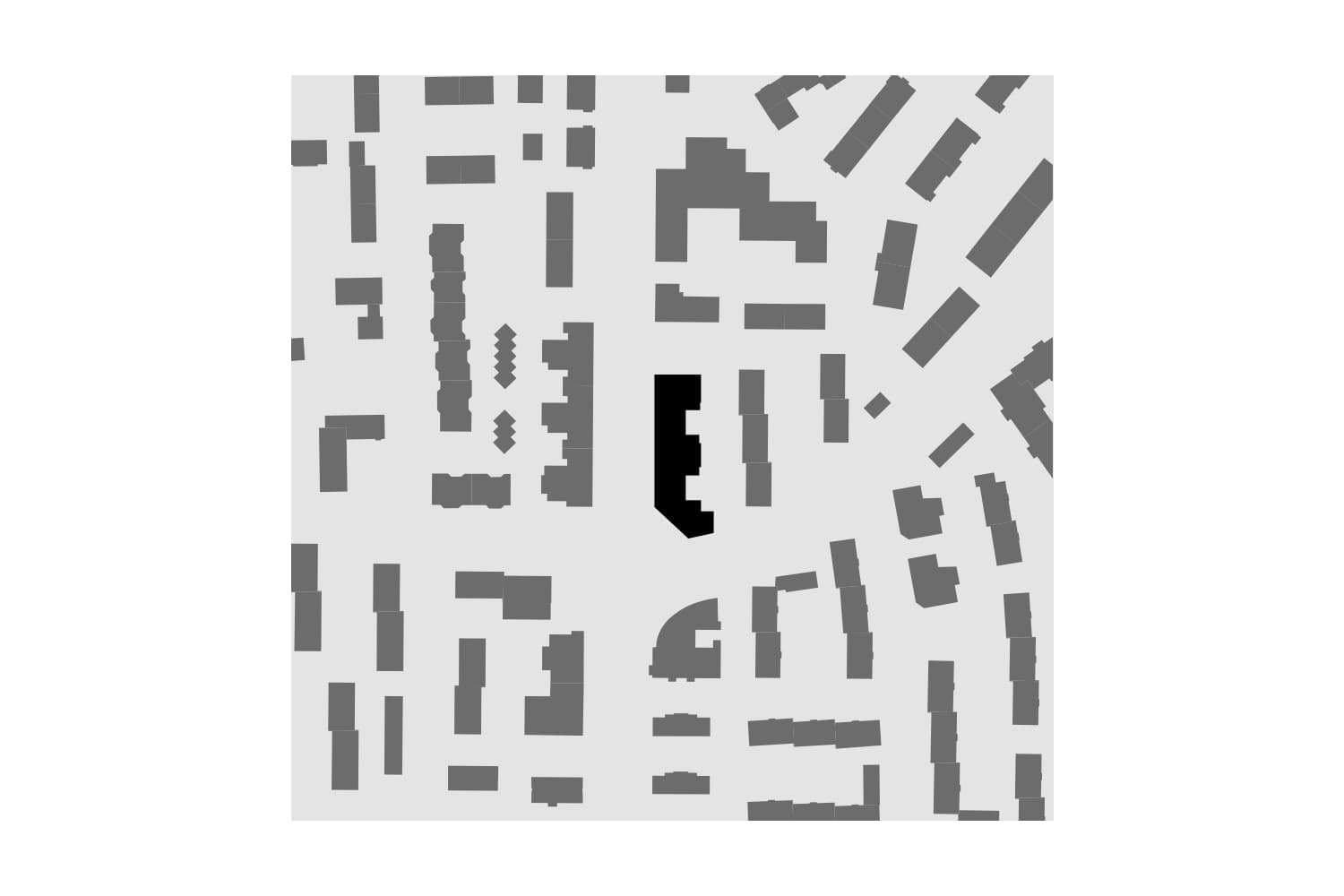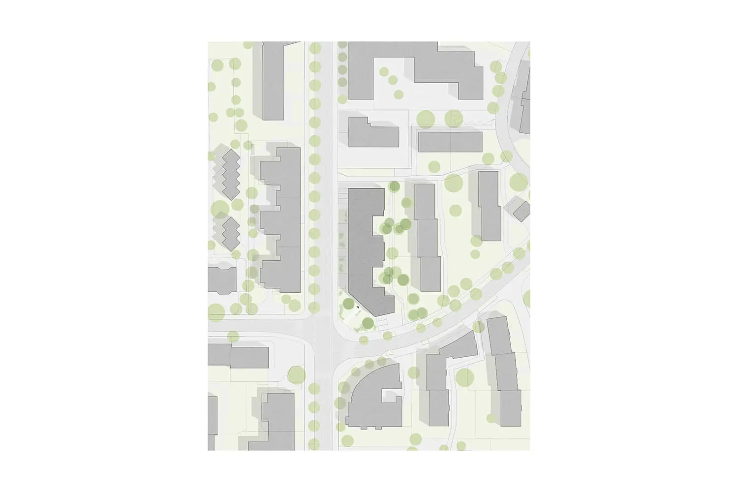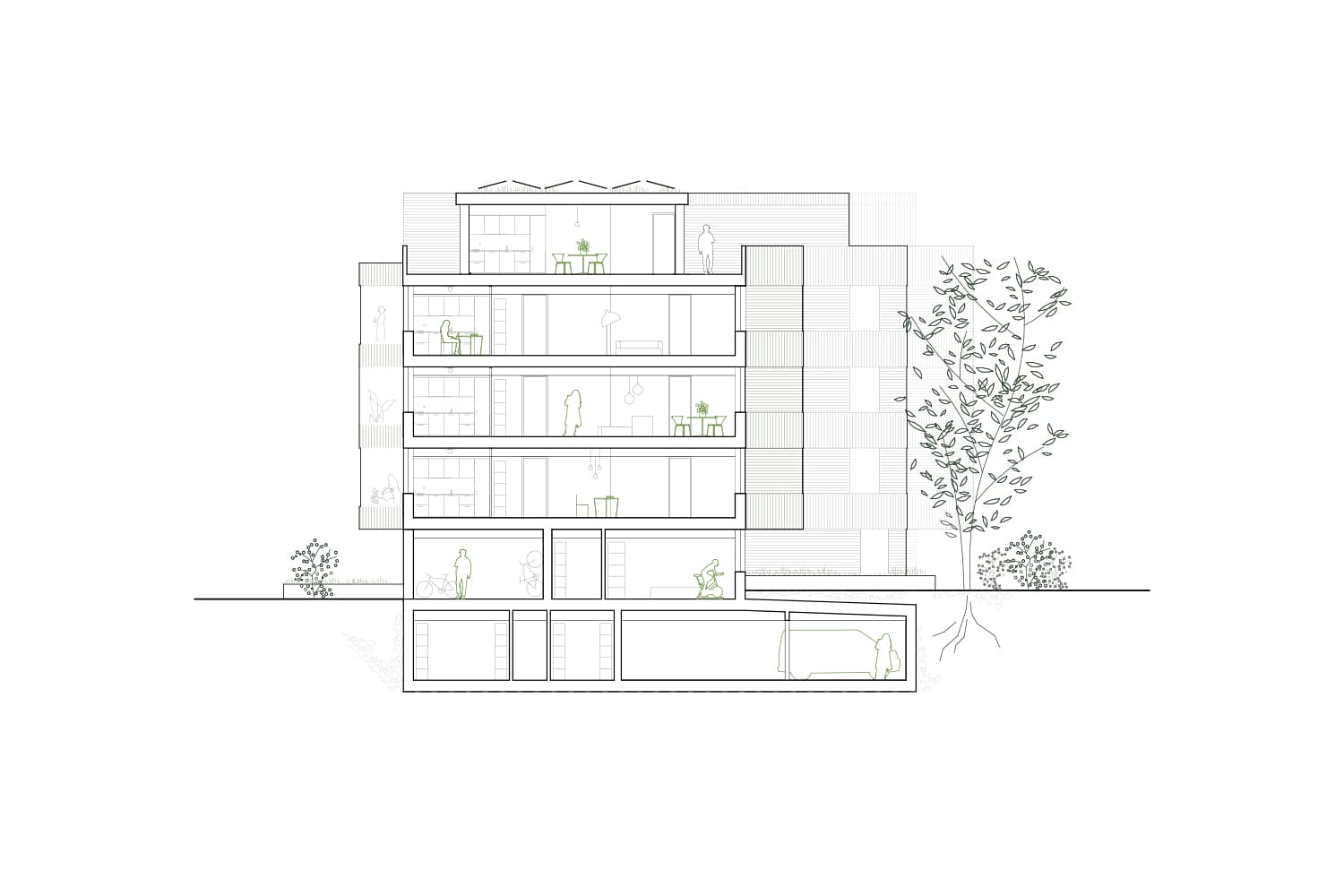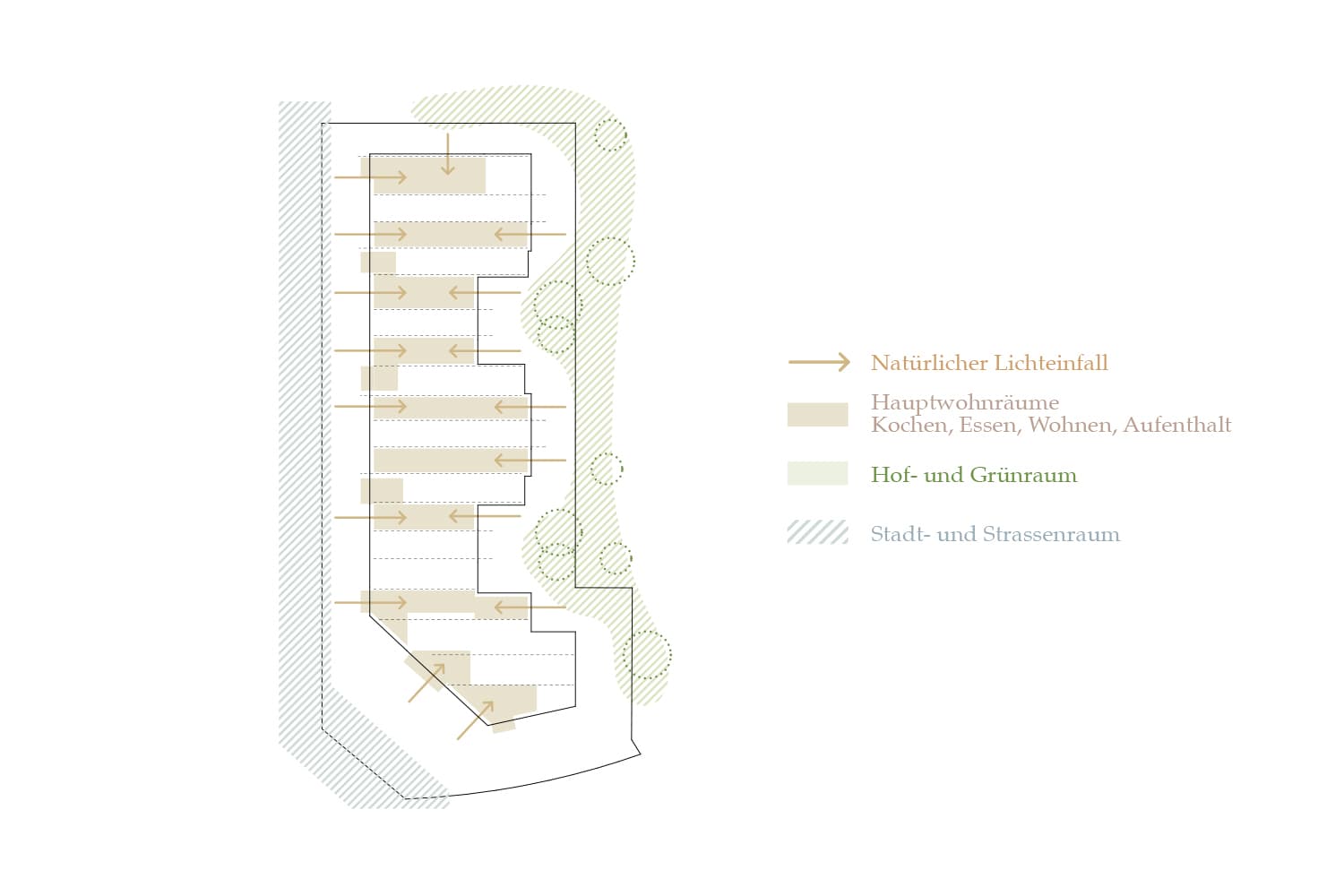Der Ersatzneubau folgt der städtischen Baulinie entlang der Albisstrasse und formuliert zugleich eine offene Beziehung zu den grünen Hofräumen im Osten. Zwischen Strassenraum und Gartenseite entsteht eine bewusste Dualität, auf die mit differenzierter Typologie, klarer Tragstruktur und präziser Adressbildung reagiert wird. Der Ersatzneubau positioniert sich selbstbewusst an der Strassenkreuzung und öffnet sich mit einer einladenden Geste dem Stadtraum. Zur optimalen Nutzung des zulässigen Bauvolumens werden die gesetzlichen Abstände sowie die Mehrlängenzuschläge je Fassadenebene exakt eingehalten. Ab dem ersten Obergeschoss strukturieren vorspringende Erker und Loggien die Fassade in ein klares, wiederkehrendes Raster. Dieses Raster ist konstruktiv ablesbar und bildet zugleich die Grundlage für die Organisation der Grundrisse. Die Wohnungen sind als durchgehende Einheiten von der Strasse zum Hof organisiert. Die Ost-West-Ausrichtung gewährleistet gute Lichtverhältnisse und differenzierte Ausblicke. Zur Hofseite verzahnt sich die gegliederte Volumetrie mit dem bestehenden Baumbestand und den begrünten Aussenräumen. Das aus der Fassadenstaffelung entwickelte Achsmass von rund 3 bis 3.5 Metern dient sowohl dem Tragwerkskonzept als auch der effizienten Grundrissorganisation und ermöglicht flexible Wohnformen. Entlang der Strasse sind konsequent lärmunempfindliche Nutzungen angeordnet, darunter Erschliessungszonen, Arbeitsküchen, Loggien und Nebenräume. Durch die strassenlärmpuffernden Küchen und Loggien fällt viel Tageslicht tief in die Wohnungen, was wiederum einen hohen Grad an Transparenz und Weitblick in die durchgrünte Umgebung ermöglicht. Innere Verglasungen unterstützen diesen Effekt und sorgen für eine helle, gut belichtete Wohnatmosphäre. Ein gemeinschaftlich nutzbarer Raum ergänzt das Wohnangebot und eignet sich aufgrund der quartierorientierten Lage für interne wie externe Nutzungen. Das Tragwerk basiert auf einem wirtschaftlichen Achsraster mit Unterzügen über die Gebäudetiefe. Es erlaubt schlanke Konstruktionshöhen, einen hohen Vorfertigungsgrad und eine effiziente Flächennutzung. Ein kompaktes Untergeschoss nimmt Nebenräume und die erforderlichen Parkplätze auf und ermöglicht den Erhalt bestehender Bäume sowie zusätzliche Begrünung im Aussenraum.