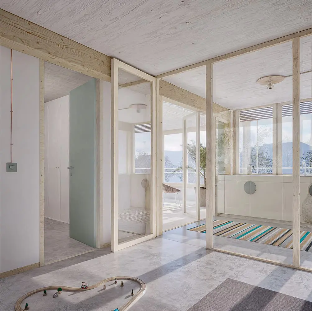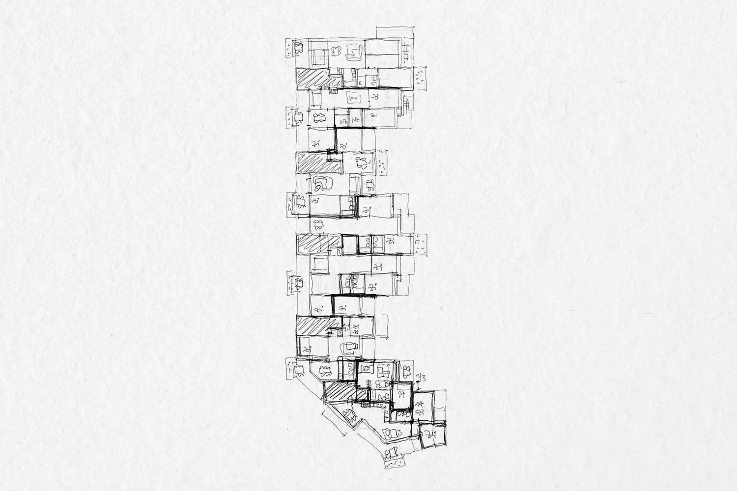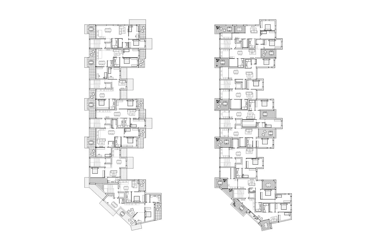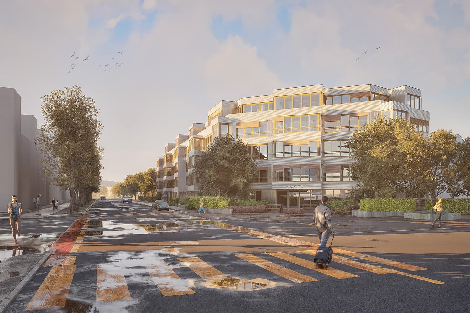 Der Ersatzneubau folgt der städtischen Baulinie entlang der Albisstrasse und formuliert zugleich eine offene Beziehung zu den grünen Hofräumen im Osten. Zwischen Strassenraum und Gartenseite entsteht eine bewusste Dualität, auf die mit differenzierter Typologie, klarer Tragstruktur und präziser Adressbildung reagiert wird. Der Ersatzneubau positioniert sich selbstbewusst an der Strassenkreuzung und öffnet sich mit einer einladenden Geste dem Stadtraum. Zur optimalen Nutzung des zulässigen Bauvolumens werden die gesetzlichen Abstände sowie die Mehrlängenzuschläge je Fassadenebene exakt eingehalten. Ab dem ersten Obergeschoss strukturieren vorspringende Erker und Loggien die Fassade in ein klares, wiederkehrendes Raster. Dieses Raster ist konstruktiv ablesbar und bildet zugleich die Grundlage für die Organisation der Grundrisse. Die Wohnungen sind als durchgehende Einheiten von der Strasse zum Hof organisiert. Die Ost-West-Ausrichtung gewährleistet gute Lichtverhältnisse und differenzierte Ausblicke. Zur Hofseite verzahnt sich die gegliederte Volumetrie mit dem bestehenden Baumbestand und den begrünten Aussenräumen. Das aus der Fassadenstaffelung entwickelte Achsmass von rund 3 bis 3.5 Metern dient sowohl dem Tragwerkskonzept als auch der effizienten Grundrissorganisation und ermöglicht flexible Wohnformen. Entlang der Strasse sind konsequent lärmunempfindliche Nutzungen angeordnet, darunter Erschliessungszonen, Arbeitsküchen, Loggien und Nebenräume. Durch die strassenlärmpuffernden Küchen und Loggien fällt viel Tageslicht tief in die Wohnungen, was wiederum einen hohen Grad an Transparenz und Weitblick in die durchgrünte Umgebung ermöglicht. Innere Verglasungen unterstützen diesen Effekt und sorgen für eine helle, gut belichtete Wohnatmosphäre. Ein gemeinschaftlich nutzbarer Raum ergänzt das Wohnangebot und eignet sich aufgrund der quartierorientierten Lage für interne wie externe Nutzungen. Das Tragwerk basiert auf einem wirtschaftlichen Achsraster mit Unterzügen über die Gebäudetiefe. Es erlaubt schlanke Konstruktionshöhen, einen hohen Vorfertigungsgrad und eine effiziente Flächennutzung. Ein kompaktes Untergeschoss nimmt Nebenräume und die erforderlichen Parkplätze auf und ermöglicht den Erhalt bestehender Bäume sowie zusätzliche Begrünung im Aussenraum.