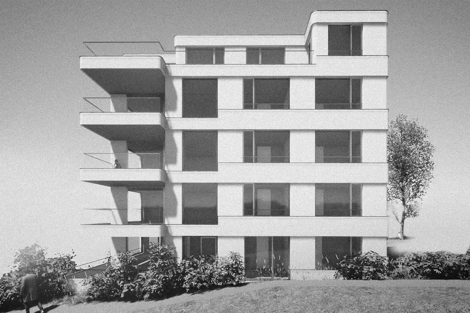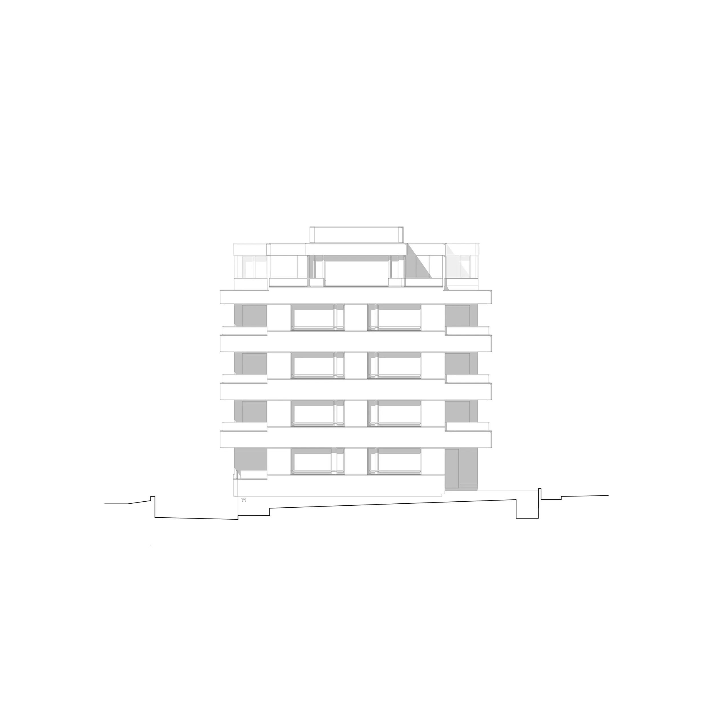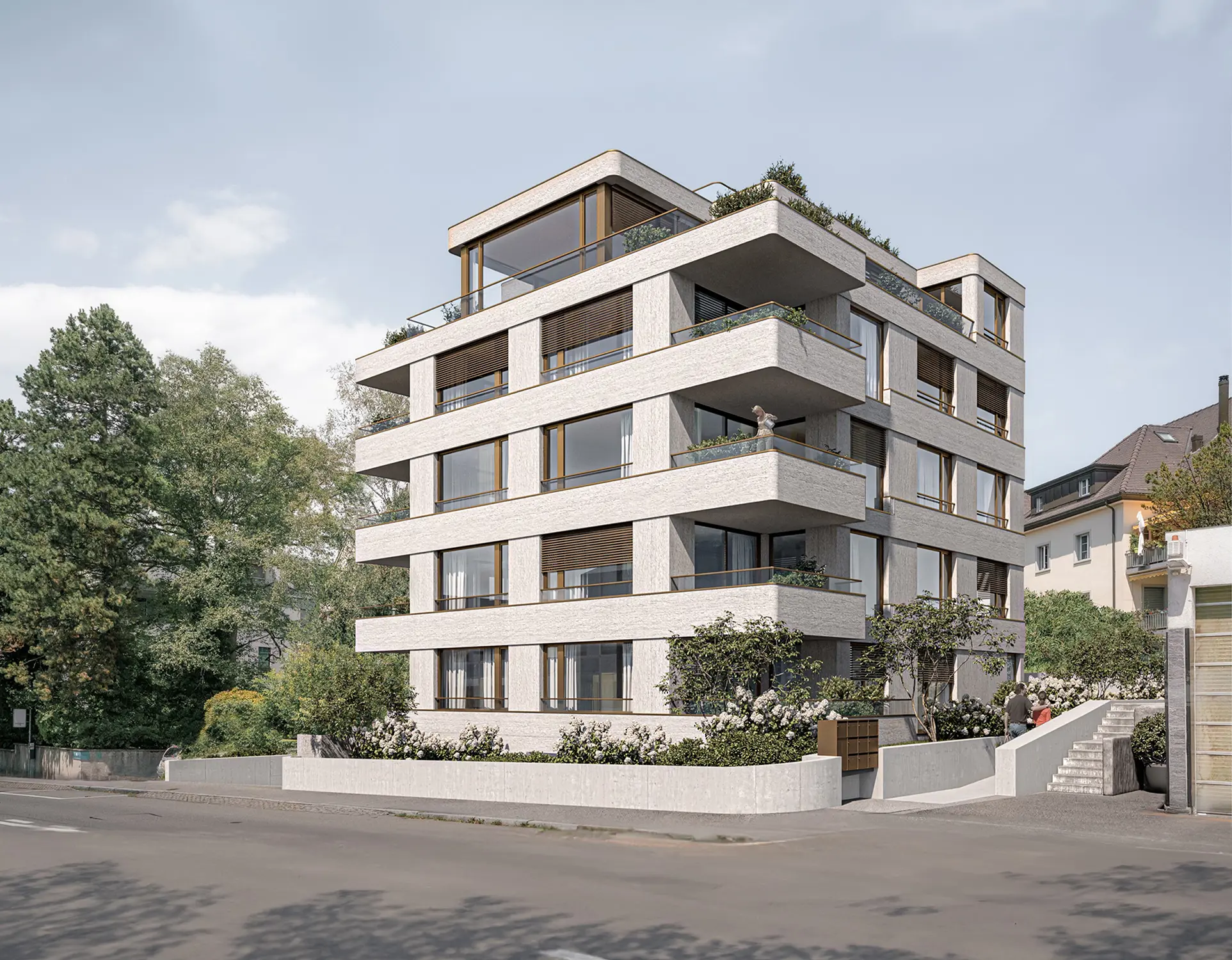 Das Stadtquartier Zürich-Fluntern hat eine attraktive leichte Hanglage und bietet trotz einer gewissen städtischen Dichte Platz für Grünräume. Man spürt die Nähe zu den Wäldern auf dem Zürichberg. Von vielen Standpunkten aus sieht man in die Weite, teilweise auch auf den Zürichsee. Die hochwertigen Geschosswohnungen sollen vom schönen Weit- und Ausblick in die Umgebung profitieren. Die gut möblierbaren Aussenräume - Terrassen, Loggien und Balkone - und die sinnvoll zonierten Wohn- und Essräume sind mit maximaler Transparenz gestaltet. Die Nachtbereiche sind zweckmässig und eher hangseitig angeordnet. Ein ökonomischer nordseitiger Erschliessungskern verbindet die Tiefgarage mit den Wohngeschossen. Die Fassade bildet die Geschossigkeit ab und orientiert sich an einer in den 1930er Jahren in den Stadtteilen am Zürichberg ausgeprägten Architektursprache mit horizontalen Brüstungsbändern und grossen Fensteröffnungen. In der Nahen Umgebung findet man - teilweise sogar fast 100 jährige - ausdrucksstarke Wohnhäuser mit horizontalen Brüstungsbändern und grossen Panoramafenstern, die dem schönen Ausblick gerecht werden. Diese Plastizität der Fassadengestaltung soll in einen zeitgemässen Kontext übertragen werden. Wand- und Brüstungselemente sind verputzt und in erdig dunklen Farbtönen gestrichen. Die Brüstungsabdeckungen in anodisiertem Aluminium spannen ein Netz über die ganze Fassade und verstärken das Licht- und Schattenspiel.