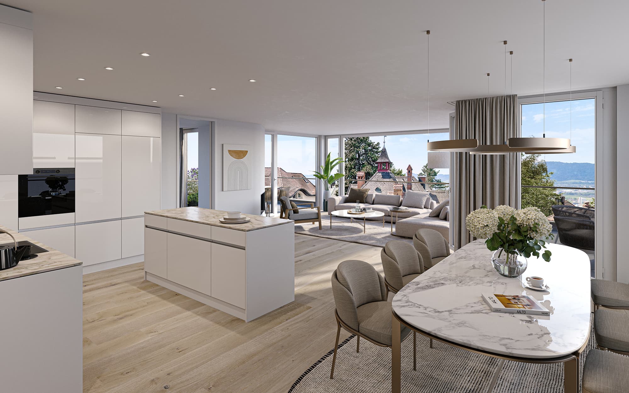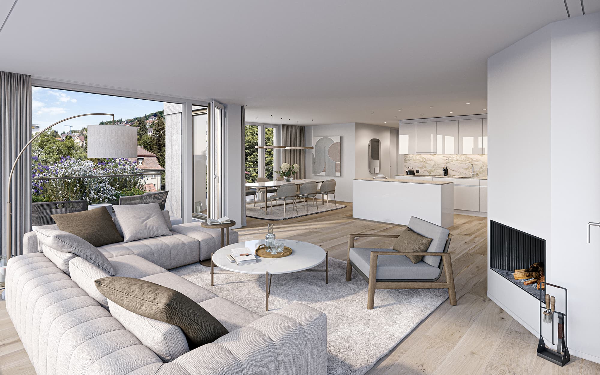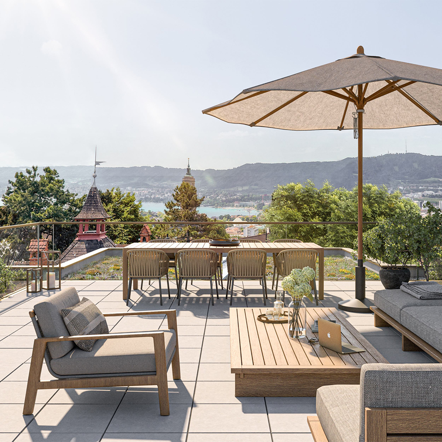 Das Stadtquartier Zürich-Fluntern hat eine attraktive leichte Hanglage und bietet trotz einer gewissen städtischen Dichte Platz für Grünräume. Man spürt die Nähe zu den Wäldern auf dem Zürichberg. Von vielen Standpunkten aus sieht man in die Weite, teilweise auch auf den Zürichsee. Die hochwertigen Geschosswohnungen sollen vom schönen Weit- und Ausblick in die Umgebung profitieren. Die gut möblierbaren Aussenräume - Terrassen, Loggien und Balkone - und die sinnvoll zonierten Wohn- und Essräume sind mit maximaler Transparenz gestaltet. Die Nachtbereiche sind zweckmässig und eher hangseitig angeordnet. Ein ökonomischer nordseitiger Erschliessungskern verbindet die Tiefgarage mit den Wohngeschossen. Die Fassade bildet die Geschossigkeit ab und orientiert sich an einer in den 1930er Jahren in den Stadtteilen am Zürichberg ausgeprägten Architektursprache mit horizontalen Brüstungsbändern und grossen Fensteröffnungen. In der Nahen Umgebung findet man - teilweise sogar fast 100 jährige - ausdrucksstarke Wohnhäuser mit horizontalen Brüstungsbändern und grossen Panoramafenstern, die dem schönen Ausblick gerecht werden. Diese Plastizität der Fassadengestaltung soll in einen zeitgemässen Kontext übertragen werden. Wand- und Brüstungselemente sind verputzt und in erdig dunklen Farbtönen gestrichen. Die Brüstungsabdeckungen in anodisiertem Aluminium spannen ein Netz über die ganze Fassade und verstärken das Licht- und Schattenspiel.