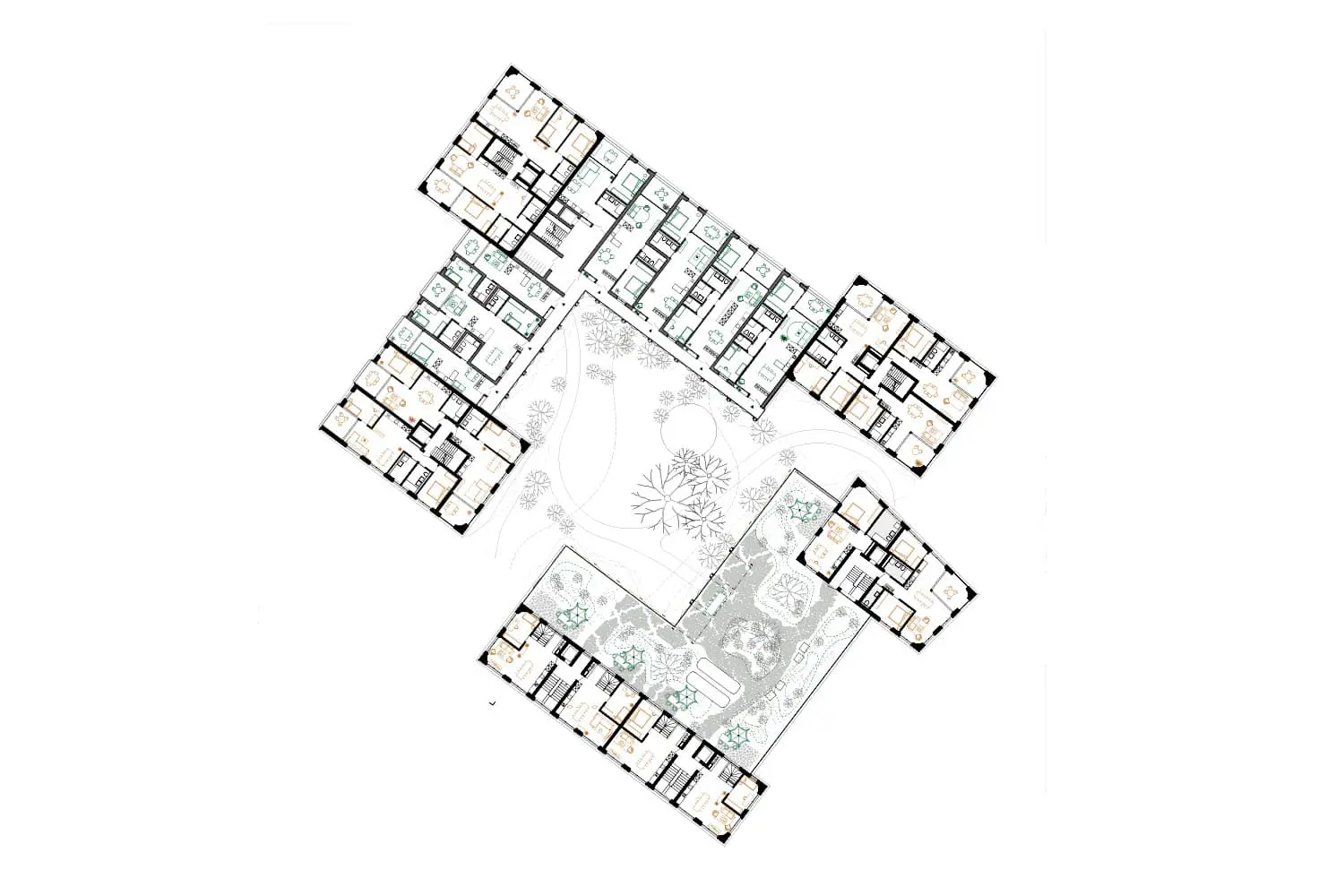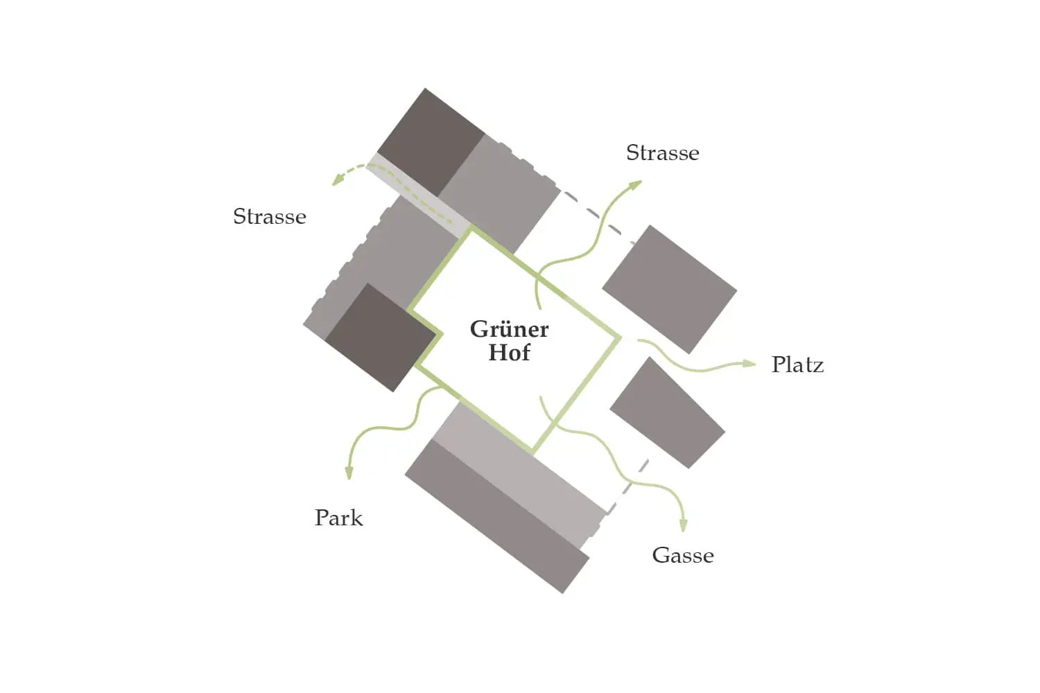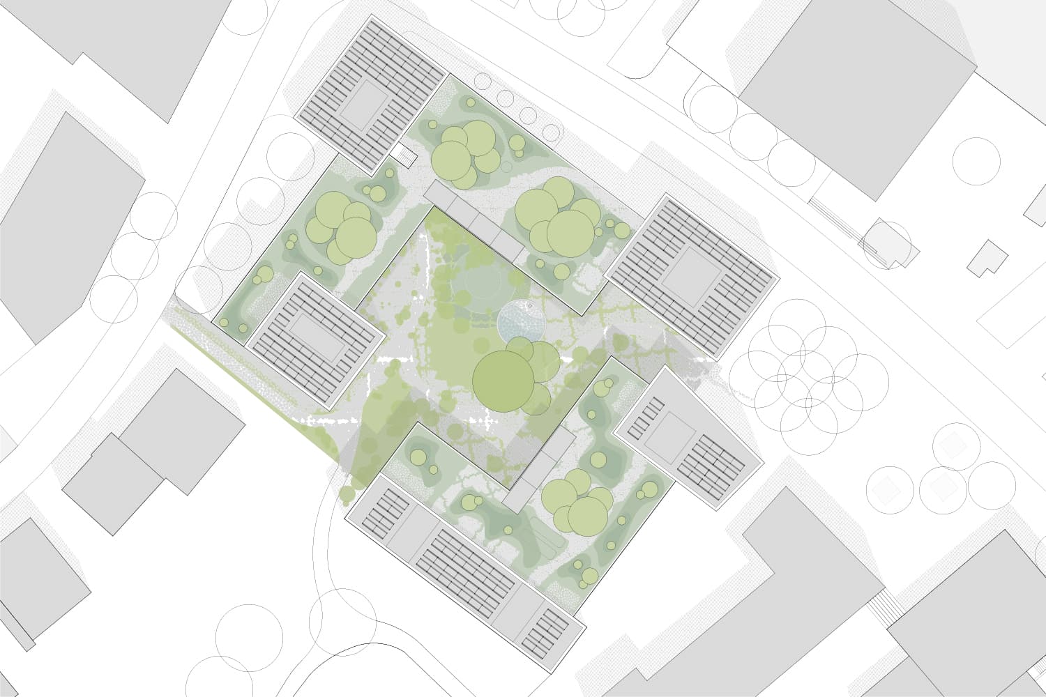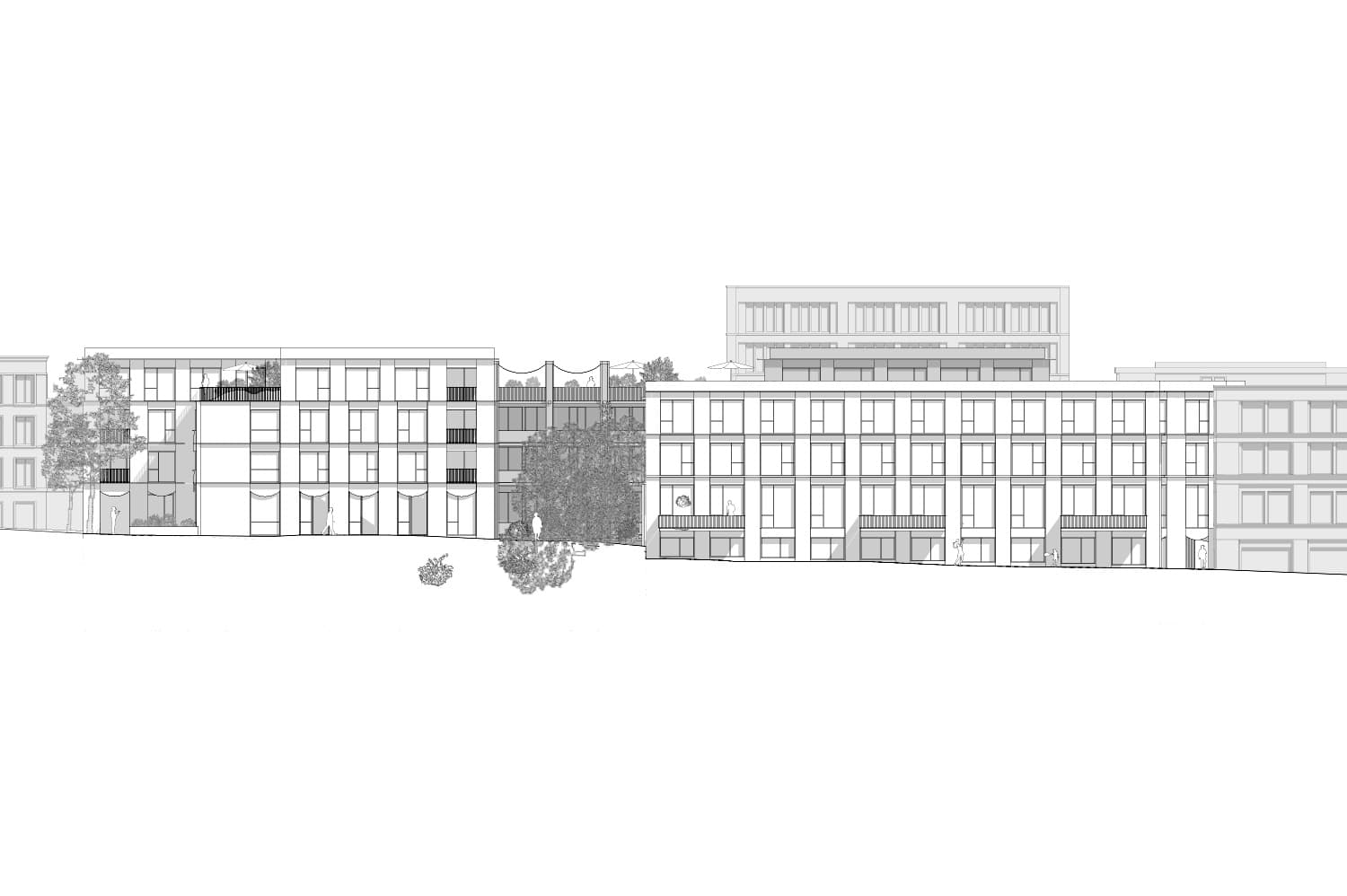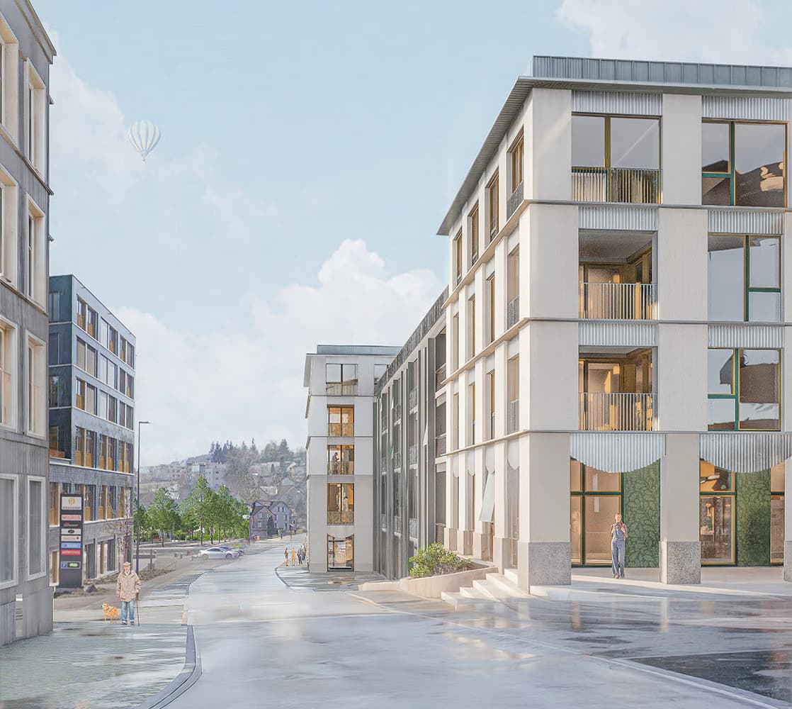 Uzwil entwickelt sich schrittweise von einer Gemeinde zu einer Stadt. Mit der zunehmenden Verdichtung entstehen neue städtische Räume, die klar gefasst und gut miteinander verbunden sind. Die Überbauung ergänzt bestehende Freiräume wie den Schifflipark und den Lindenring und stärkt das Zentrum durch eine klare Ordnung von Platz, Hof, Gasse und Strasse. Im Mittelpunkt der Anlage liegt ein grosszügig begrünter Hof. Er bildet das räumliche Zentrum und ist für Bewohnerinnen, Bewohner und Besucher gut zugänglich. Überdachte Übergänge und Veranden verbinden Gebäude und Aussenraum und schaffen geschützte Aufenthaltsbereiche. Der Hof ist offen gestaltet und öffnet sich gezielt zur Umgebung, sodass Innenraum, Aussenraum und Landschaft miteinander in Beziehung treten. Die Bebauung setzt sich aus Türmen und niedrigeren Winkelbauten zusammen. Beide Bautypen sind klar erkennbar und funktional getrennt. Die Winkelbauten fassen den Hof räumlich und bilden mit ihren Veranden eine vermittelnde Schicht zwischen Wohnen und Gemeinschaftsraum. Diese Struktur ist auch in den Grundrissen ablesbar. Die Fassade gliedert sich durch einen klaren Rhythmus aus Wandstücken und Fenstern. Dadurch wird die Bauweise ruhig und verständlich. Die Erdgeschosse entlang der Strasse sind für Gewerbe vorgesehen und direkt vom öffentlichen Raum zugänglich. Die Wohnbereiche orientieren sich zum Hof und bieten geschützte, ruhige Adressen. Der motorisierte Verkehr wird gebündelt von der Lindenstrasse in das Gebäude geführt. Der Aussenraum bleibt dadurch weitgehend autofrei. Fussgänger sowie Radfahrer können sich sicher und ungehindert bewegen. Die Wege sind barrierefrei angelegt und folgen der Topografie des Geländes. Die Überbauung ist flexibel nutzbar und erlaubt unterschiedliche Wohnformen. Gemeinschaftliche Dachterrassen und klar definierte Erschliessungsräume fördern Begegnung. Die klare Gliederung der Baukörper ermöglicht zudem eine Teilveräusserung einzelner Gebäudeteile. Der Aussenraum fördert Biodiversität, nutzt wiederverwendete Materialien und ist als durchlässiger, begrünter Stadtraum gestaltet.