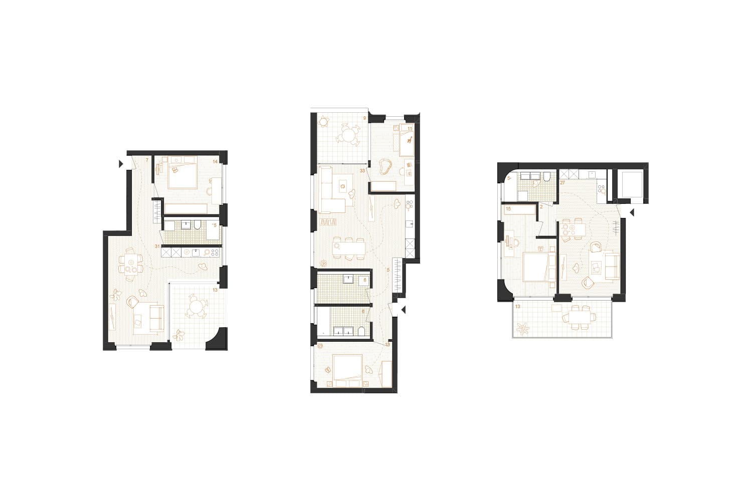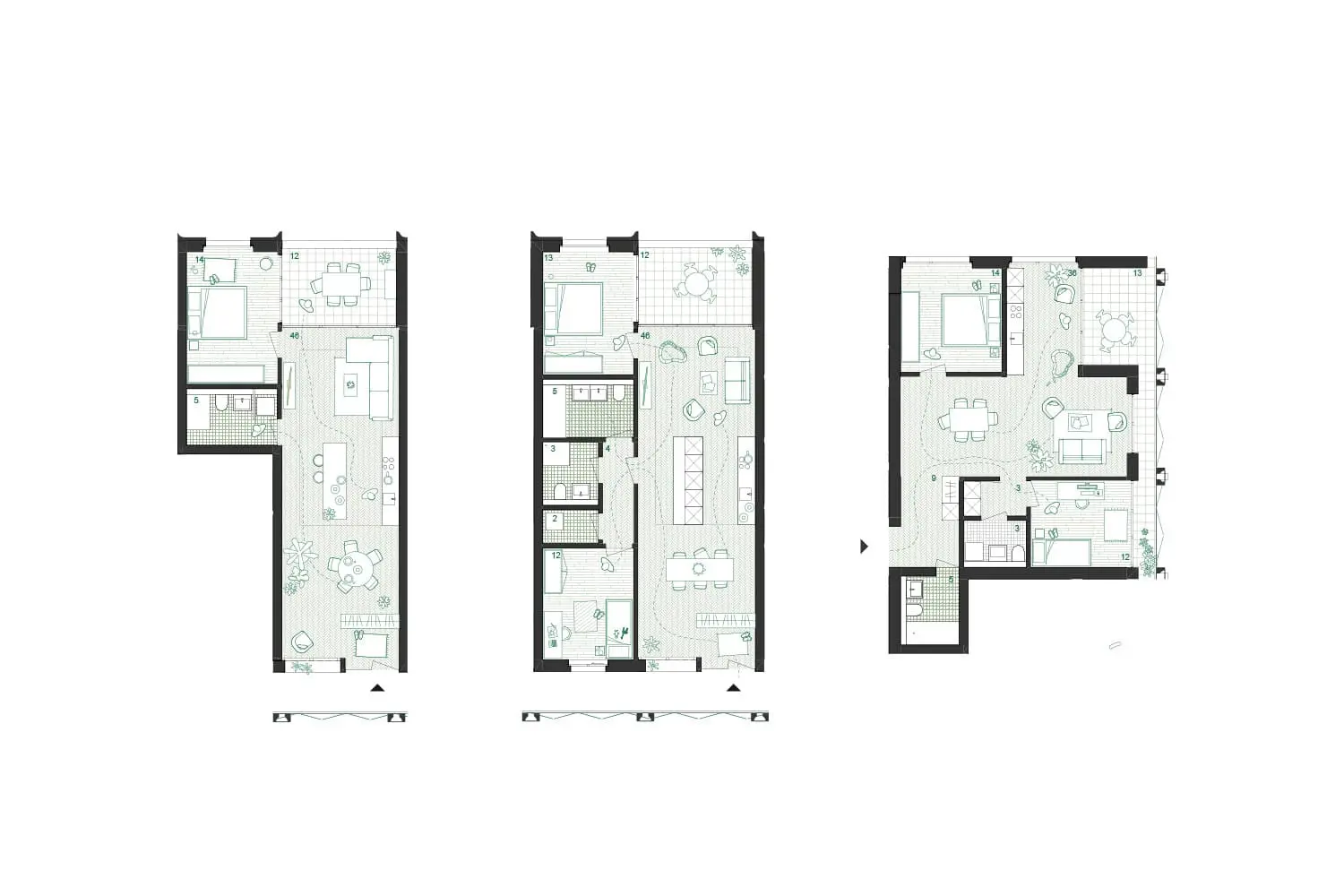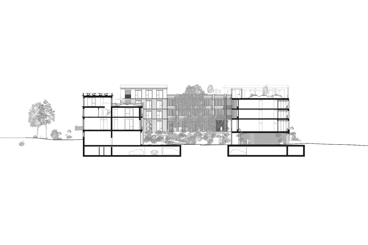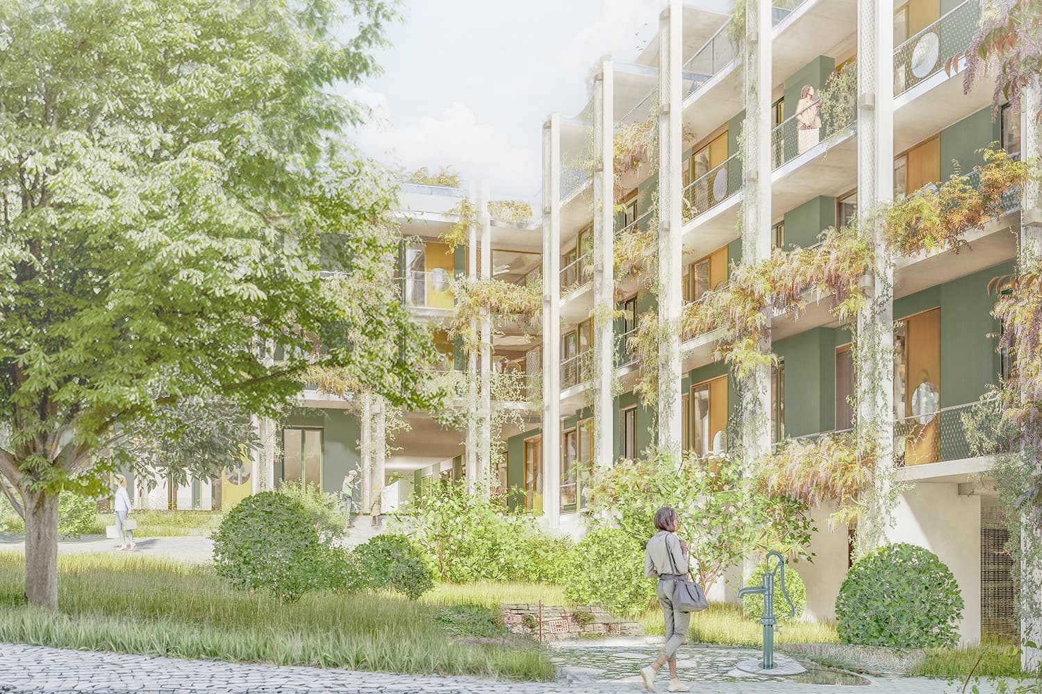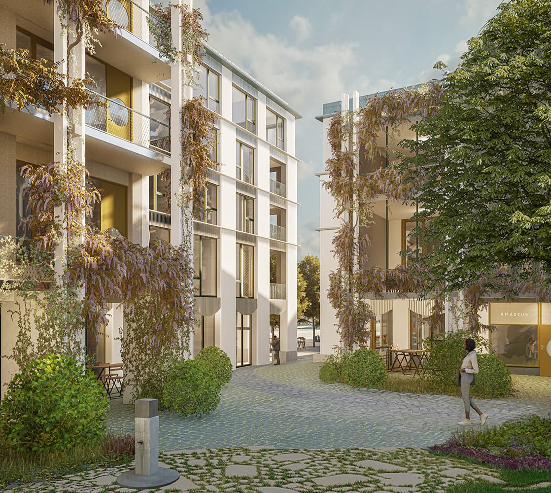 Uzwil entwickelt sich schrittweise von einer Gemeinde zu einer Stadt. Mit der zunehmenden Verdichtung entstehen neue städtische Räume, die klar gefasst und gut miteinander verbunden sind. Die Überbauung ergänzt bestehende Freiräume wie den Schifflipark und den Lindenring und stärkt das Zentrum durch eine klare Ordnung von Platz, Hof, Gasse und Strasse. Im Mittelpunkt der Anlage liegt ein grosszügig begrünter Hof. Er bildet das räumliche Zentrum und ist für Bewohnerinnen, Bewohner und Besucher gut zugänglich. Überdachte Übergänge und Veranden verbinden Gebäude und Aussenraum und schaffen geschützte Aufenthaltsbereiche. Der Hof ist offen gestaltet und öffnet sich gezielt zur Umgebung, sodass Innenraum, Aussenraum und Landschaft miteinander in Beziehung treten. Die Bebauung setzt sich aus Türmen und niedrigeren Winkelbauten zusammen. Beide Bautypen sind klar erkennbar und funktional getrennt. Die Winkelbauten fassen den Hof räumlich und bilden mit ihren Veranden eine vermittelnde Schicht zwischen Wohnen und Gemeinschaftsraum. Diese Struktur ist auch in den Grundrissen ablesbar. Die Fassade gliedert sich durch einen klaren Rhythmus aus Wandstücken und Fenstern. Dadurch wird die Bauweise ruhig und verständlich. Die Erdgeschosse entlang der Strasse sind für Gewerbe vorgesehen und direkt vom öffentlichen Raum zugänglich. Die Wohnbereiche orientieren sich zum Hof und bieten geschützte, ruhige Adressen. Der motorisierte Verkehr wird gebündelt von der Lindenstrasse in das Gebäude geführt. Der Aussenraum bleibt dadurch weitgehend autofrei. Fussgänger sowie Radfahrer können sich sicher und ungehindert bewegen. Die Wege sind barrierefrei angelegt und folgen der Topografie des Geländes. Die Überbauung ist flexibel nutzbar und erlaubt unterschiedliche Wohnformen. Gemeinschaftliche Dachterrassen und klar definierte Erschliessungsräume fördern Begegnung. Die klare Gliederung der Baukörper ermöglicht zudem eine Teilveräusserung einzelner Gebäudeteile. Der Aussenraum fördert Biodiversität, nutzt wiederverwendete Materialien und ist als durchlässiger, begrünter Stadtraum gestaltet.