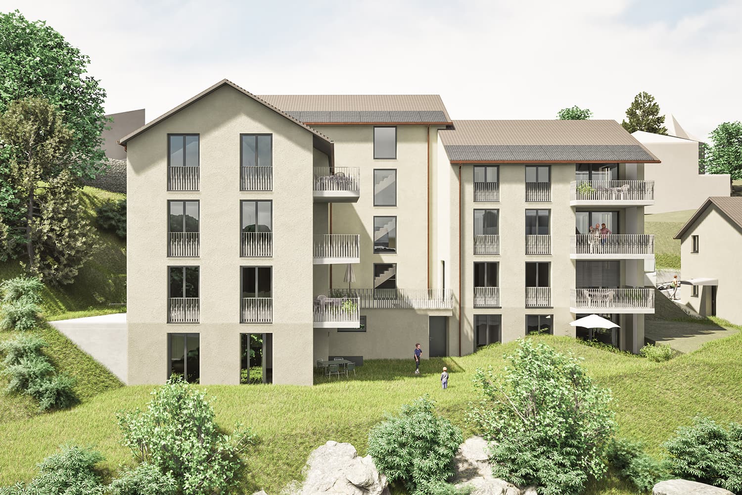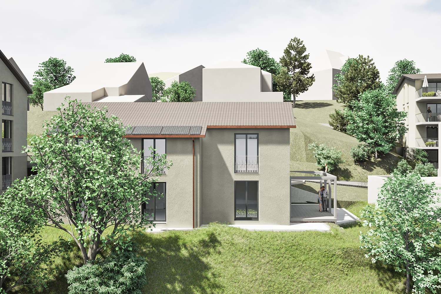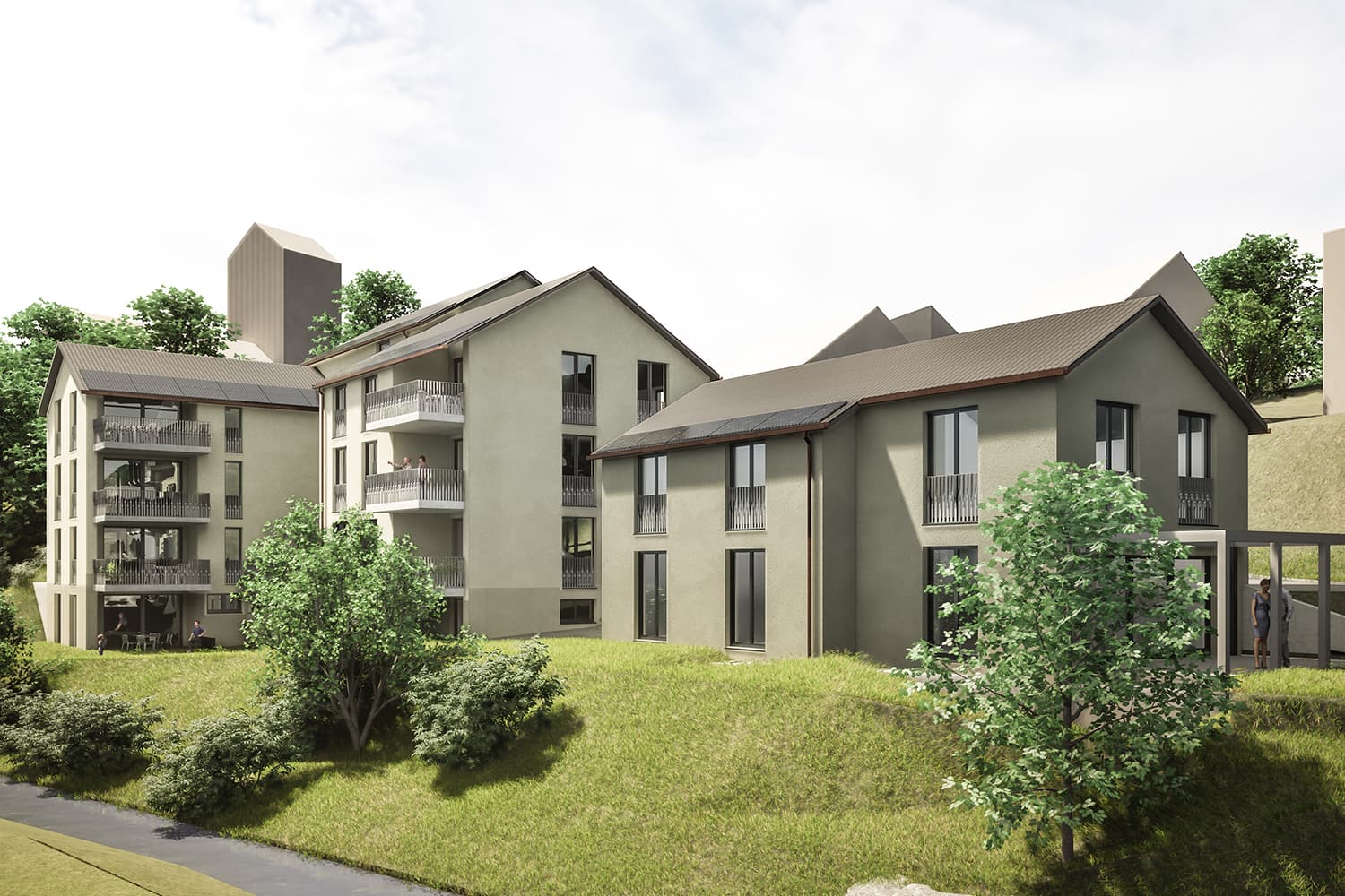 Das Mehrfamilienhaus und das Einfamilienhaus an der Chilegass ergänzen die bestehende Bebauung als jeweils eigenständige Baukörper und reagieren in Setzung und Volumetrie auf die natürliche Topografie. Beide Gebäude orientieren sich an der kleinteiligen Dorfstruktur und vermeiden lange, durchgehende Fassaden. Durch Staffelungen und gezielte Proportionen treten sie auch in der Vertikalen als einzelne Einheiten in Erscheinung und vermitteln zwischen Strassenraum, Bachlauf und angrenzender Landschaft. Die Wohnungen beziehungsweise Wohnbereiche sind auf unterschiedliche Lebensmodelle ausgerichtet und ermöglichen flexible Nutzungen über die Zeit. Öffnungen und Aussenräume richten sich zu Grünflächen und Freiräumen aus und schaffen gezielte Blickbezüge. Konstruktion und Materialwahl setzen auf robuste, langlebige Lösungen mit geringem Unterhaltsaufwand. Hindernisarme Zugänge, energieeffiziente Gebäudetechnik sowie klare, funktionale Grundrisse sichern eine nachhaltige Nutzbarkeit und lassen individuelle Anpassungen im Rahmen der baulichen Möglichkeiten zu.
